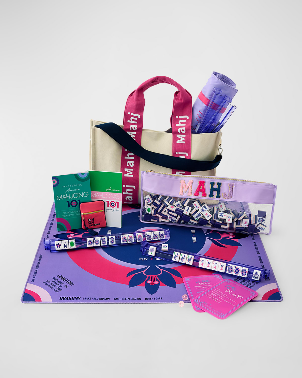 Let the Lilac Soiree Collection transform your game nights into unforgettable parties that will leave you craving more. With their magnificent shades of purple, baby pink, and navy, these tiles are the epitome of celebration. They exude an aura of joy and excitement, making every moment of your Mahjong game a thrilling experience. Set Includes: 160 acrylic tiles, MahjItAll 2.0 Bag, Lilac Mahj Tile Bag, Mahjong Coin amp; Dice Bag, Let's Rack amp; Roll Bag, Acrylic Rack amp; Pusher Set, Mahjong ti