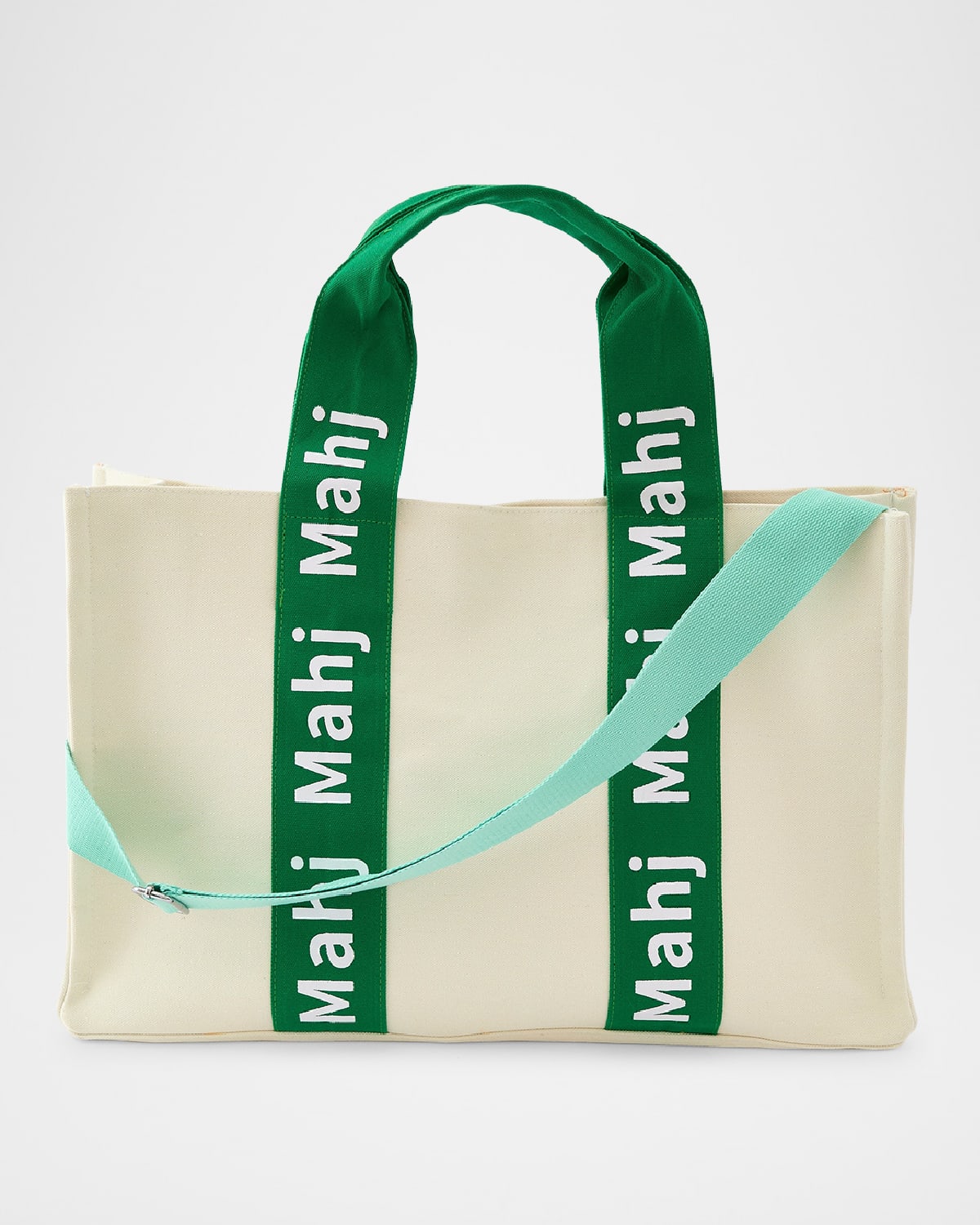 This refreshed canvas storage companion is designed to bring a smile to your face. Not only does it elevate your Mahjong gaming experience, but it also doubles as a fantastic work bag. This spacious bag is tailormade to accommodate all your Mahjong essentials, including tiles, racks, the rack amp; roller bag, mat, and more. To ensure durability, it comes with a protective dust bag, keeping it in pristine condition. Removable pink crossbody strap Rolled top handles Magnetic snap closure to main compartment Snap closures at sides to expand depth Two interior pouches Interior zip pocket Approx. 15"H x 22"W x 6"D Body: canvas (cotton) Lining: cotton Spot clean Imported