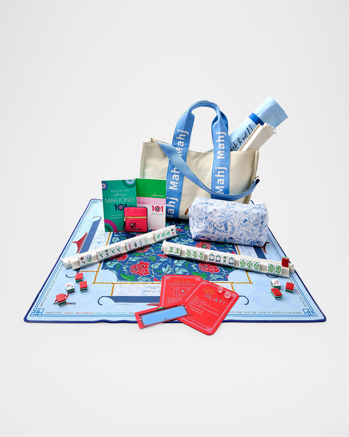 Set Includes: 160 acrylic tiles, Liberty Mat, Rack amp; Pusher Set, Tile Shufflers, Line Finders, Blue Amazon Tile Bag, Let's Rack amp; Roll Bag, MahjItAll Tote Bag, Mahjong 101 Book, and Mahjong 101 Quick Start Guide Acrylic tiles and accessories Canvas tote bag Neoprene mahjong mat Imported