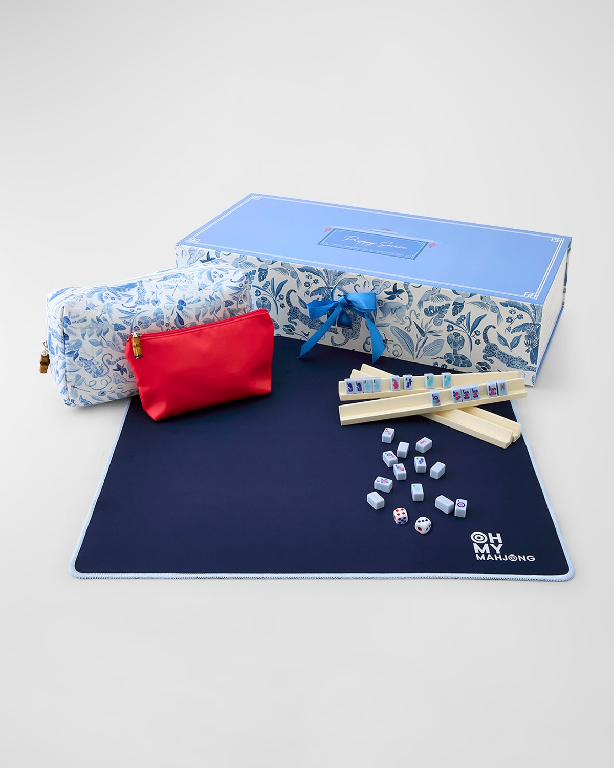 Take your Mahjong game wherever you go with the Mahjong Travel Set! This compact and lightweight set effortlessly slips into your carryon, ensuring that the joy of Mahjong is always within reach on your adventures. Crafted with Preppy Soiree designs, this set exudes elegance and style. Simply toss it all into the travel bag, and you're ready to turn any trip into a Mahjong adventure. Set Includes: 160 acrylic mahjong tiles, four white wooden racks, one mahjong mat, one tile tote, and one travel bag Travel Bag created in collaboration with artist Catherine Cartie Mahjong mat: neoprene, 22"Sq. Wooden racks, 10.25"L Bags: Canvas (cotton) Imported
