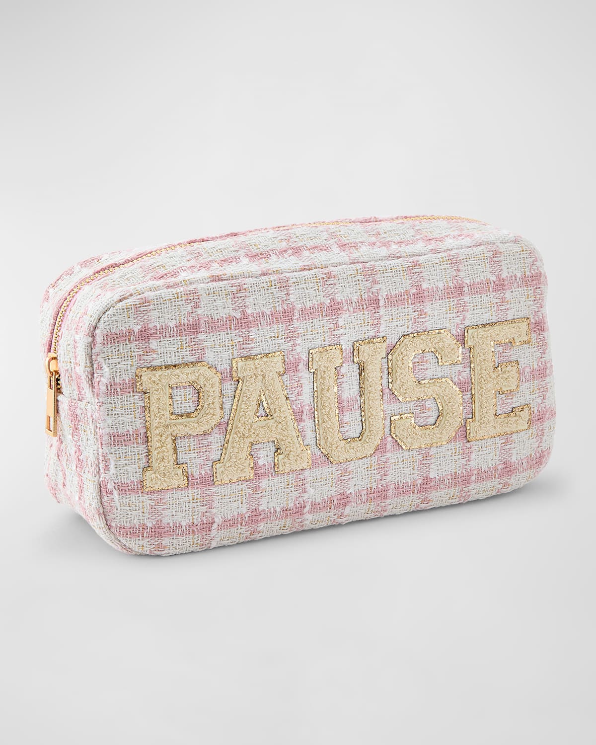 Elevate your mahjong game with our chic pink tweed bag, adorned with letters forming the word "PAUSE" and accented by a rose gold zipper for a glamorous touch. Designed with a lined interior, this bag ensures the safety and security of your American Mahjong tile sets and playing cards. Whether you're playing at home or on the go, this bag will keep your essentials organized and stylishly protected. Zip top closure Holds a full set of tiles Approx. 6"H x 11"W x 4"D Wool with polyester lining Wipe clean Imported