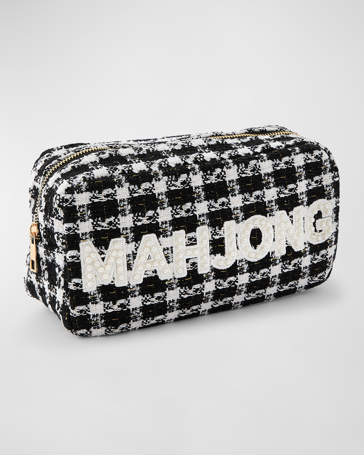 This tweed American Mahjong Storage Bag is as cute as can be, with MAHJONG spelled out in luxurious plastic faux pearl letters. The rose gold zipper adds a touch of glam, while the lined interior keeps your Mahjong Tiles and playing cards safe and secure. Zip top closure Holds a full set of tiles Approx. 6"H x 11"W x 4"D Wool with polyester lining Wipe clean Imported
