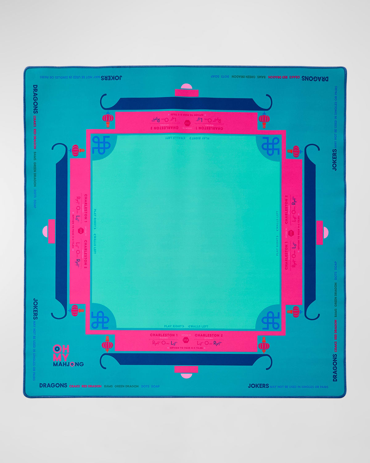 This mat boasts lively colors, including two beautiful shades of green, hot pink, and chic navy accents (like the trim!) It's designed with topnotch quality for a soft yet sturdy surface during your Mahjong games. Featuring a nonslip surface, it ensures your tiles stay put as you play like a seasoned pro. Plus, it includes essential rules for American Mahjong, covering everything from directions of The Charleston, suit and dragon pairings, gameplay and wall direction, and the pesky no jokers in a pair rule. Comes with a canvas drawstring bag for easy storage Approx. 33"Sq. Neoprene Machine washable Imported
