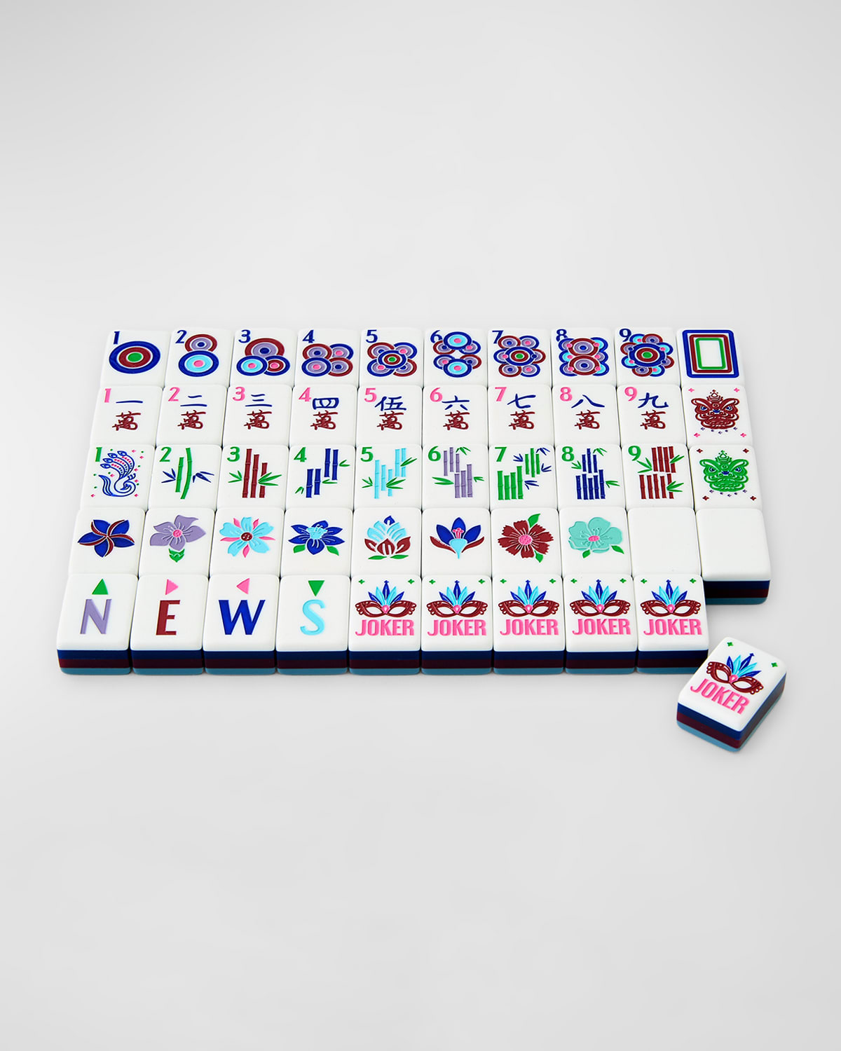 Crafted of acrylic Tiles, approx. 0.9"W x 0.8"D x 1.3"T Imported Set includes: 156 Tiles 19 Bams, Cracks and Dots (4 of each), 108 N E W S (4 of each) = 16 Red, Green and White Dragon (4 of each), 12 Flowers, 12 Jokers, 8