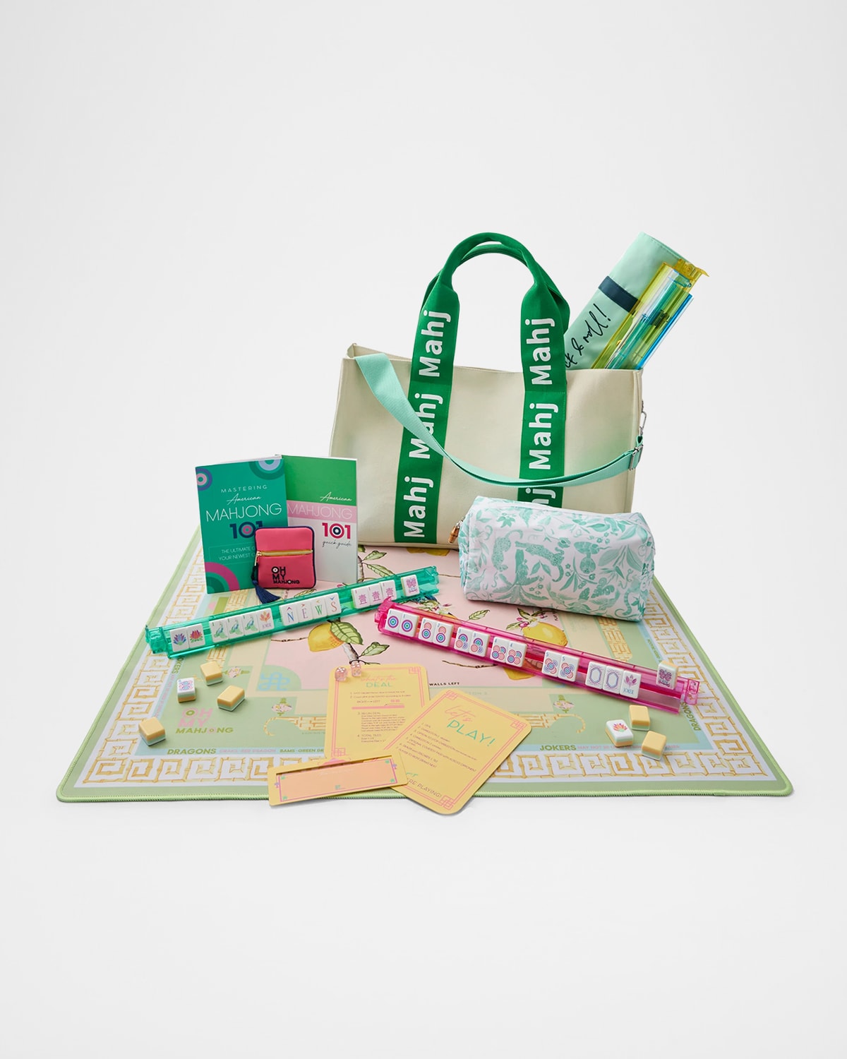 Set Includes: 160 acrylic tiles, Citrus Songbird Mat, Rack amp; Pusher Set, Tile Shufflers, Line Finders, Green Amazon Tile Bag, Let's Rack amp; Roll Bag, MahjItAll Tote Bag, Mahjong 101 Book, and Mahjong 101 Quick Start Guide Acrylic tiles and accessories Canvas tote bag Neoprene mahjong mat Imported