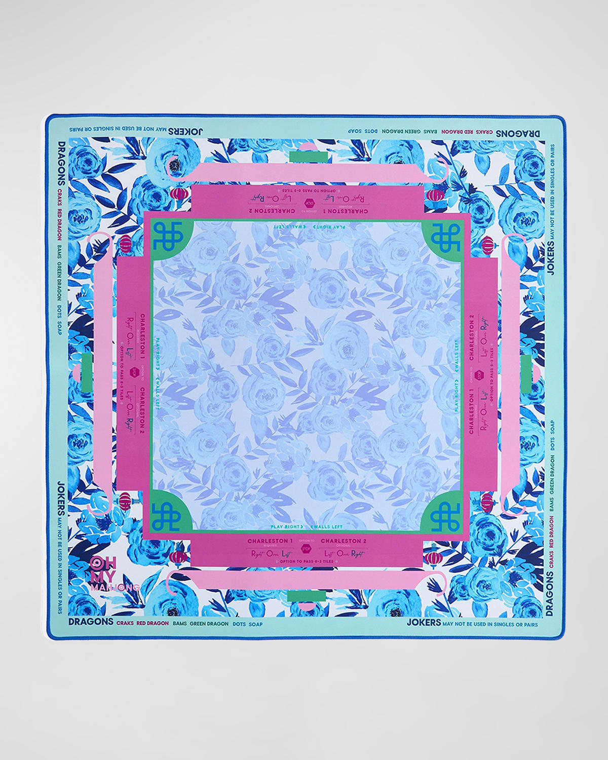 The Grand Bloom Mat is a stunning collaboration with designer Brooke Wright. It features a captivating design of blue flowers with pink accents, creating a luxurious and inviting atmosphere for your next game night. But don't be fooled by its beauty this mat is also crafted for functionality. With a nonslip surface, you can say goodbye to tiles scattering across the table! Printed right on the mat are the essential rules for American Mahjong, including everything from directions for The Charleston to the "no jokers in a pair" rule. Comes with a canvas drawstring bag for easy storage Created in collaboration with Brooke Wright Approx. 33"Sq. Neoprene Machine washable Imported