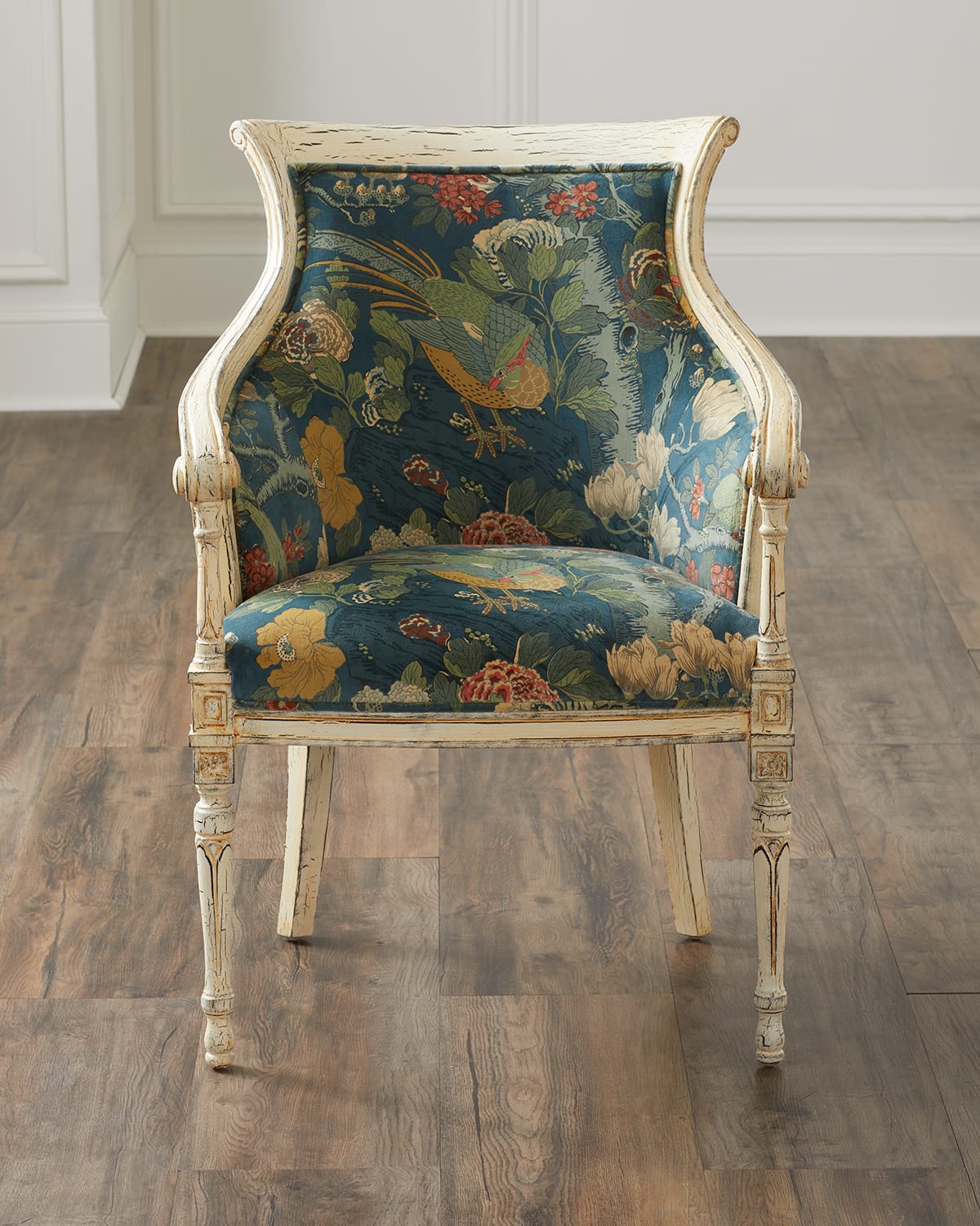 Chair featuring a velvet floral motif and cane accents Handcrafted of maple wood, rattan, cotton, and polyester Overall, approx. 25.5"W x 26"D x 36"T Seat, approx. 17"W x 17.5"D x 19.5"T Finished back Sold individually Made in USA Weight, 40.0 lbs Boxed weight, approximately 45.0 lbs