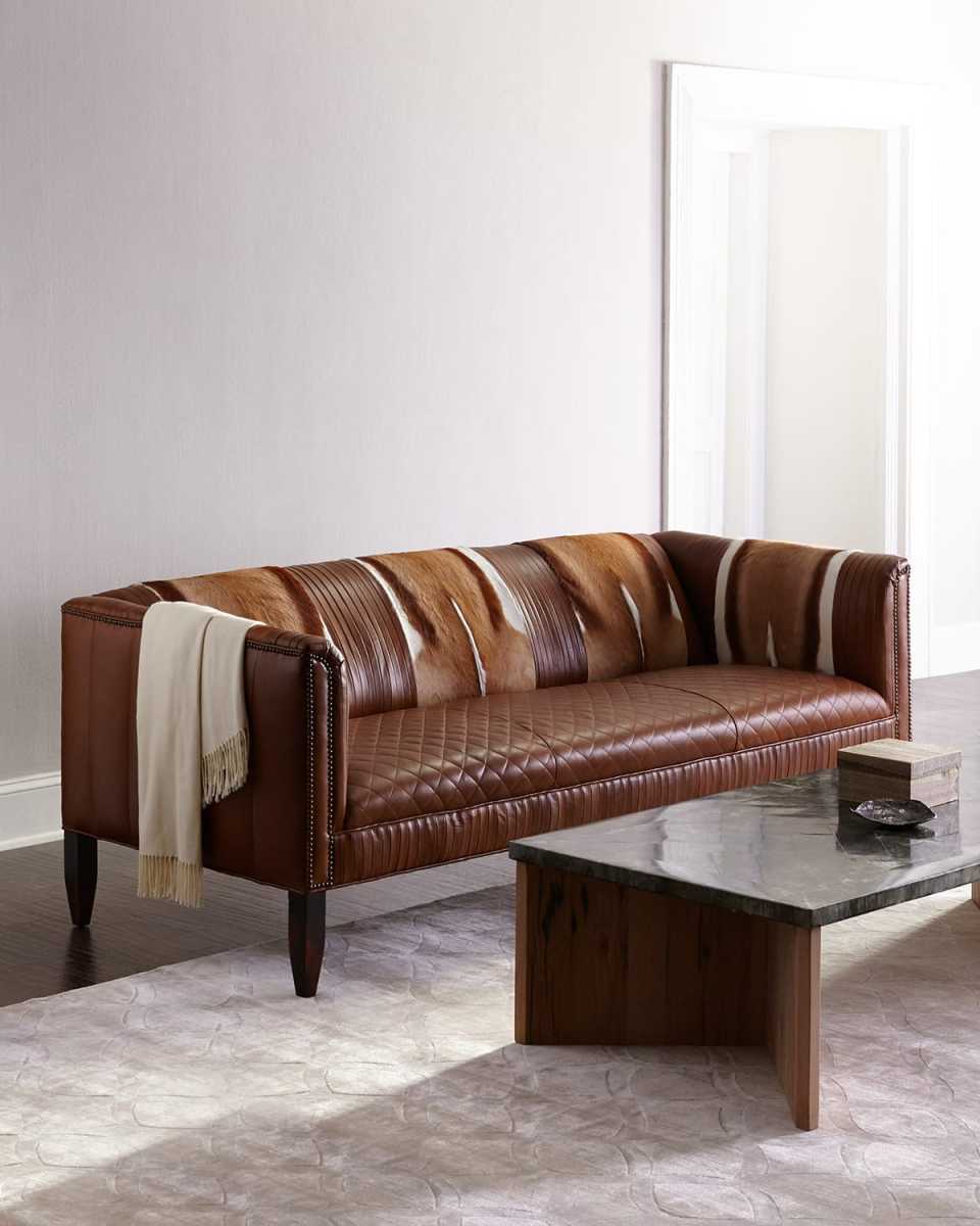EXCLUSIVELY AT NEIMAN MARCUS Handcrafted sofa. Pullup leather upholstery with hairhide springbok inserts on inside back and inside arms. 2" diamond quilting on seat. 4" channel strips on outside arms and outside back. Natural nailhead trim. 87"W x 36"D x 31"T; seat, 73"W x 23"D x 18"T. Made in the USA. Boxed weight, approximately 160 lbs.