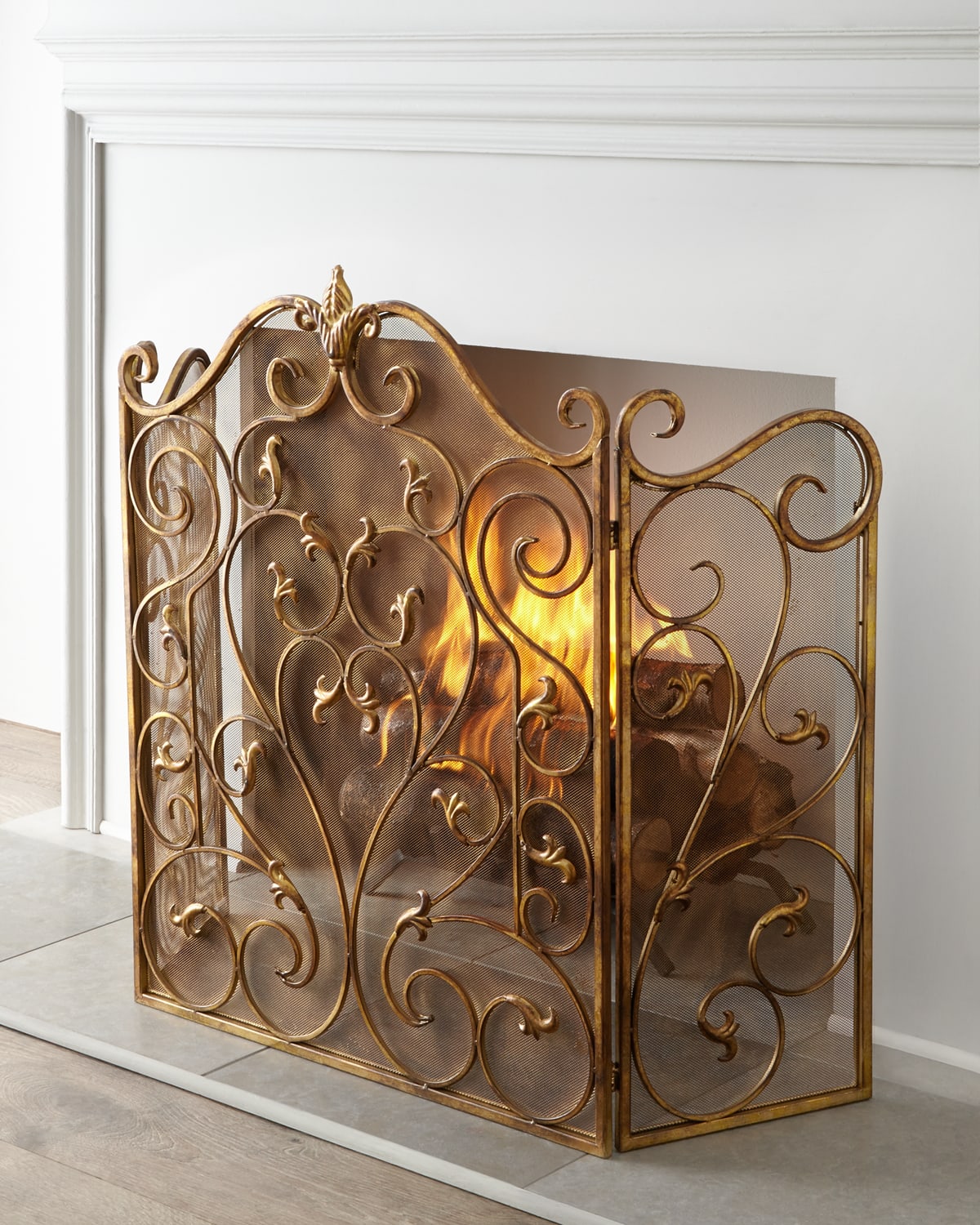 Scrolldesign fireplace screen. Made of metal and mesh. Side panels fold in for storage. Handpainted burnishedgold finish. 36"W x 12"D x 36"T. Imported. Boxed weight, approximately 10 lbs.