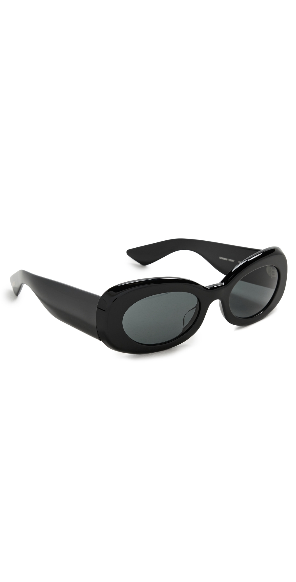Chunky design. Hardshell case and soft drawstring pouch included. Oval frame. Non-polarized lenses. Made in Italy. Acetate frame. Plastic lenses. Measurements: Width: 6in / 15cm Height: 1.75in / 4.5cm Lens Width: 53mm Bridge: 21mm Arms: 145mm