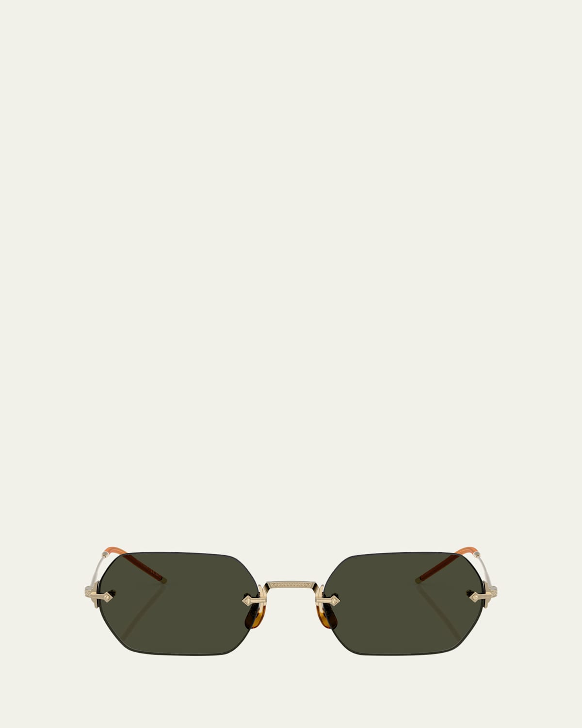 Oliver Peoples "TK13" hexagonal sunglasses with titanium frames Coin edge filigree featured on the exterior and interior Eye/bridge/temple (in mm): 52/20/145 Lightly tinted solid lenses Adjustable nose pads Thin, tapered arms Capped earpieces 100% UVA/UVB protection Made in Italy