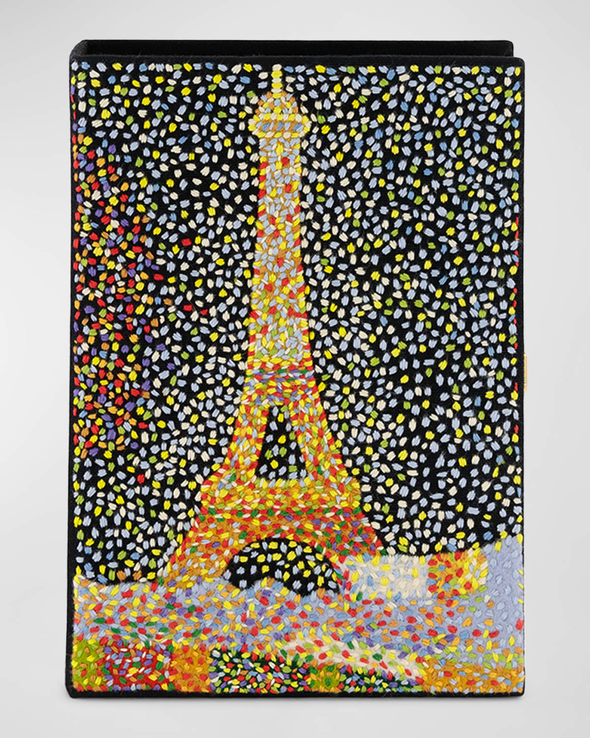 Olympia LeTan signature book clutch bag in cotton, wool, and stainless steel "Cover" design of The Eiffel Tower by Georges Seurat Liftlock clasp closure Interior, one slip pocket Lining: Cotton Dry clean Approx. 8"H x 5.5"W x 1.2"D Item Weight (Lbs.): 2.2 Made in Portugal
