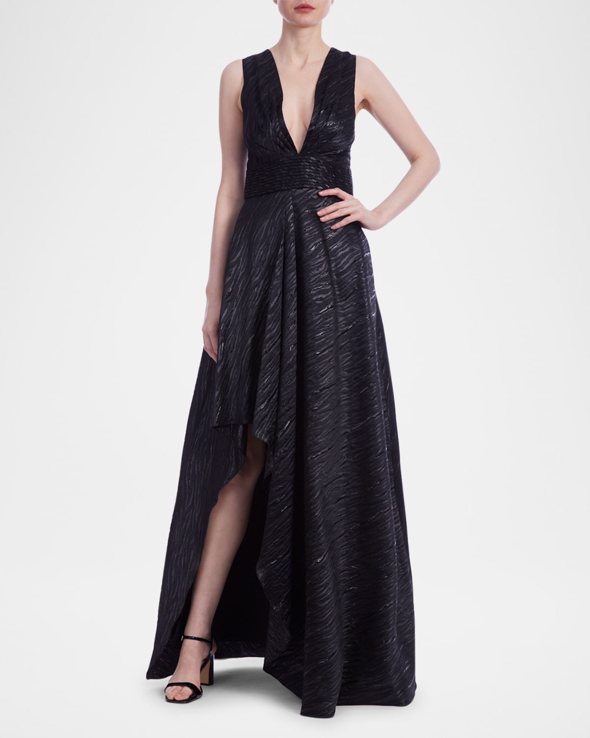 One33 Social metallic gown with pleated waistband and front gatherings Deep V neckline Sleeveless Highlow hem Full length Aline silhouette Invisible back zipper Polyester/metallic fibers/Amni® nylon Lining: Polyester Dry clean Imported