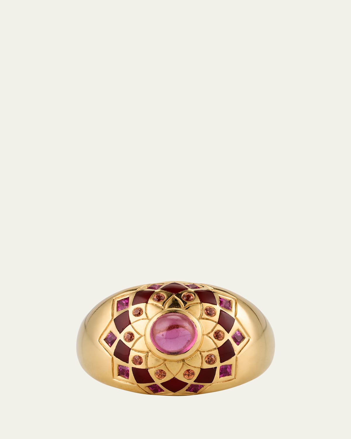 18K Yellow Gold Temple Mandala Dome Ring with Carnelian, Sapphires and Pink Tourmaline, Size