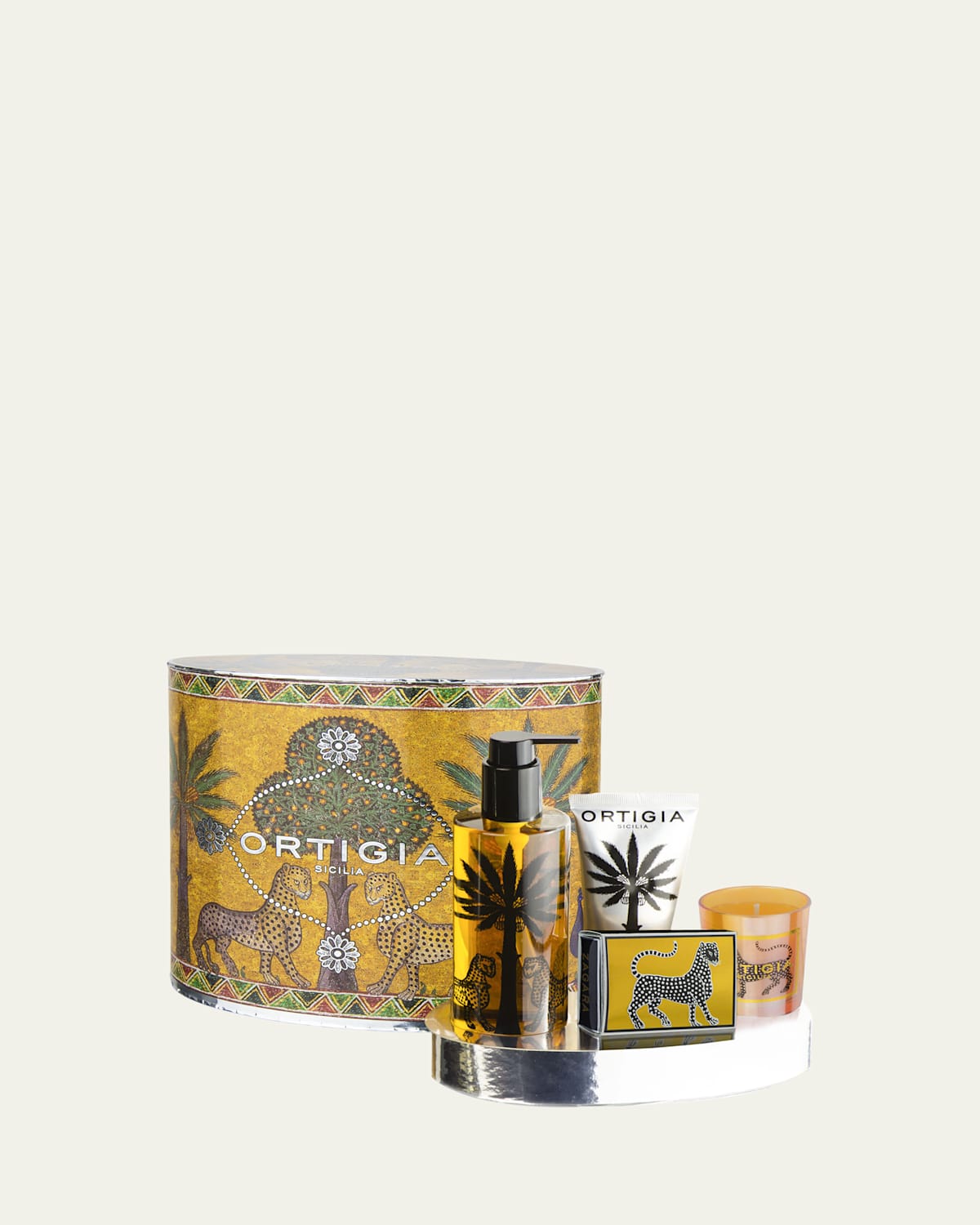 A keepsake printed and silverlined box contains a selection of the bestselling Ortigia products in the woodsy and citrus scent of Sicilian orange blossoms. Fragrance: A highly aromatic distillation from flowers of the orange tree, with neroli petitgrain and wood bases. A rich citrus scent of Sicilian orange groves. Set Includes: 8.5 oz. shower gel, 2.8 oz. candle, 1.4 oz. soap bar, 2.7 oz. hand cream Candle Burn Time: 25 hours Made in Italy