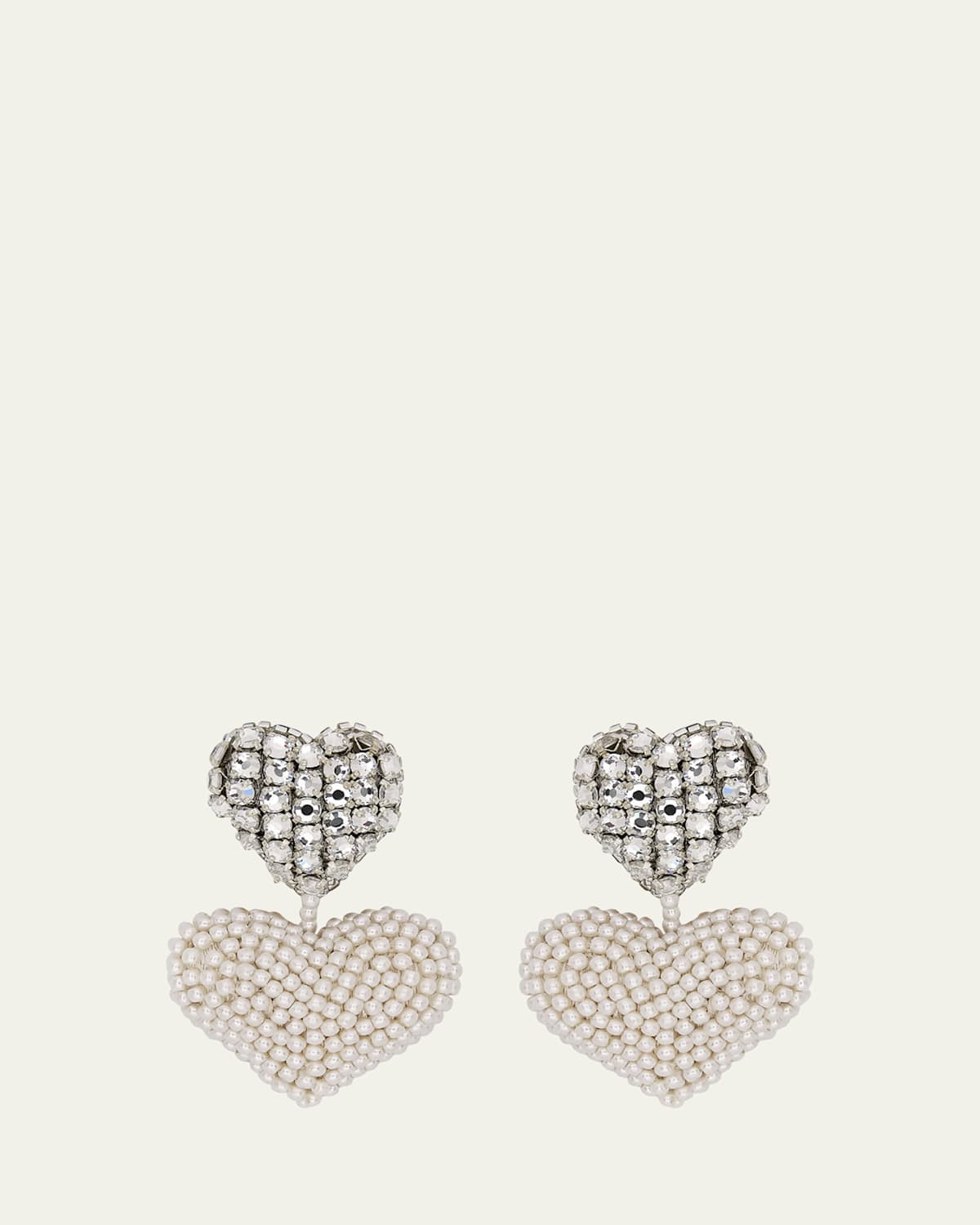 Pearly beads and glass crystals form heartshaped posts and drops on these glitzy Oscar de la Renta earrings. Approx. 1.8" length Shiny silvertone brass Glass crystals and plastic beads Clipon backs Imported