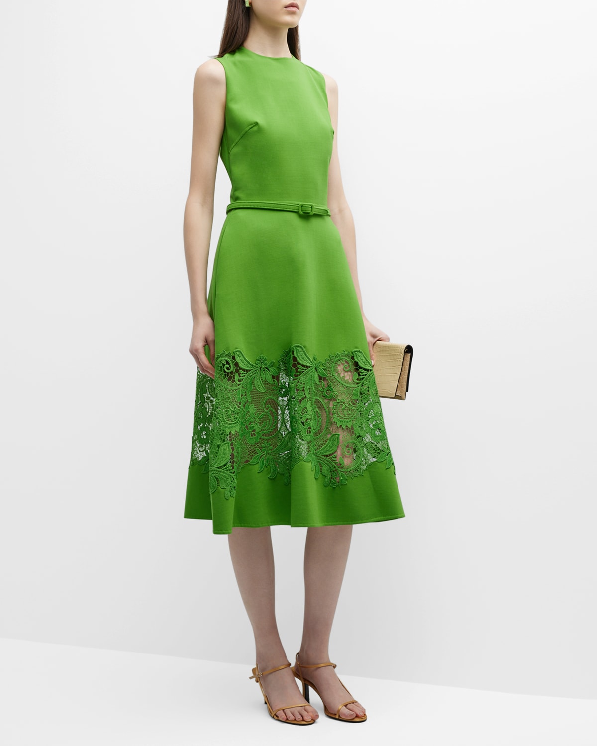 Oscar de la Renta midi dress with a corded lace inset at the hem High neckline Sleeveless Concealed back zip Belted waist Side slip pockets Hem falls below the knee Aline silhouette Polyester/silk Dry clean Made in Italy