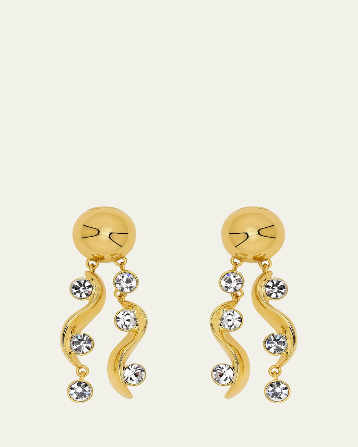 Wavy dangles hang from a polished dome on these Oscar de la Renta earrings. Round glass crystals add shine to the twin waves. Approx. 2.5" length 24karat goldplated brass Clipon backs Made in Italy