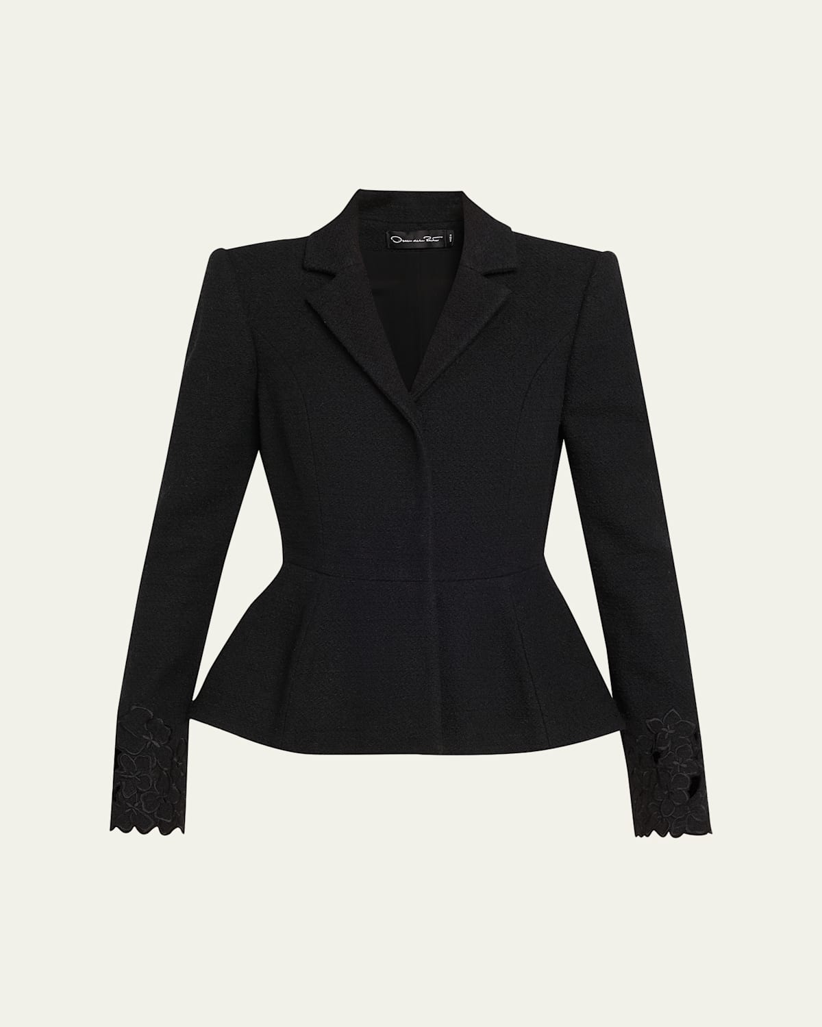 Oscar de la Renta boucle suit jacket featuring floral embroidered cutout cuff details and a peplum hem Notch lapels; singlebreasted front Long sleeves Slim fit Flounce hem Concealed button closure Cotton/virgin wool/polyester Lining: Silk Dry clean Made in Italy