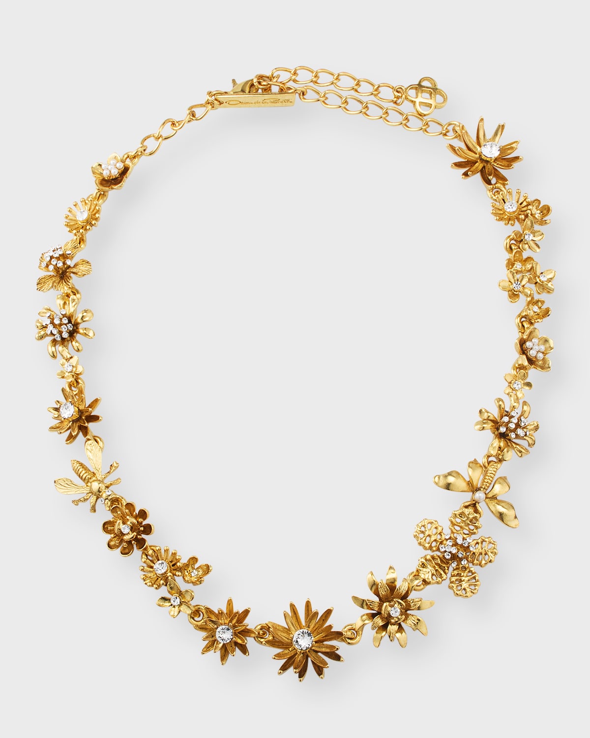 Oscar de la Renta necklace Approx. 20" length Shiny pewter and brass hardware Glass crystals and pearly resin Adjustable length Lobster clasp Made in USA