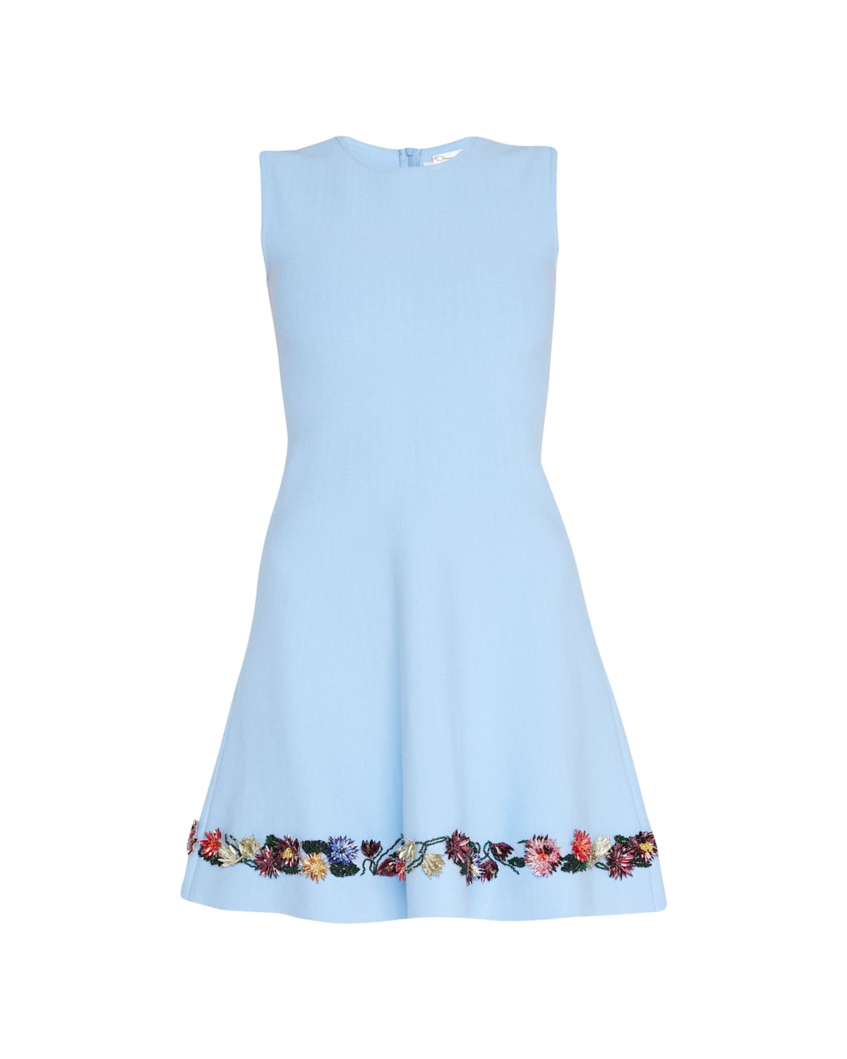 Oscar de la Renta knit dress with floral crystal embroidery on hem Jewel neckline Sleeveless Fit and flare silhouette Mini length Back zip Viscose/polyester/polyamide Unlined Dry clean Made in Italy