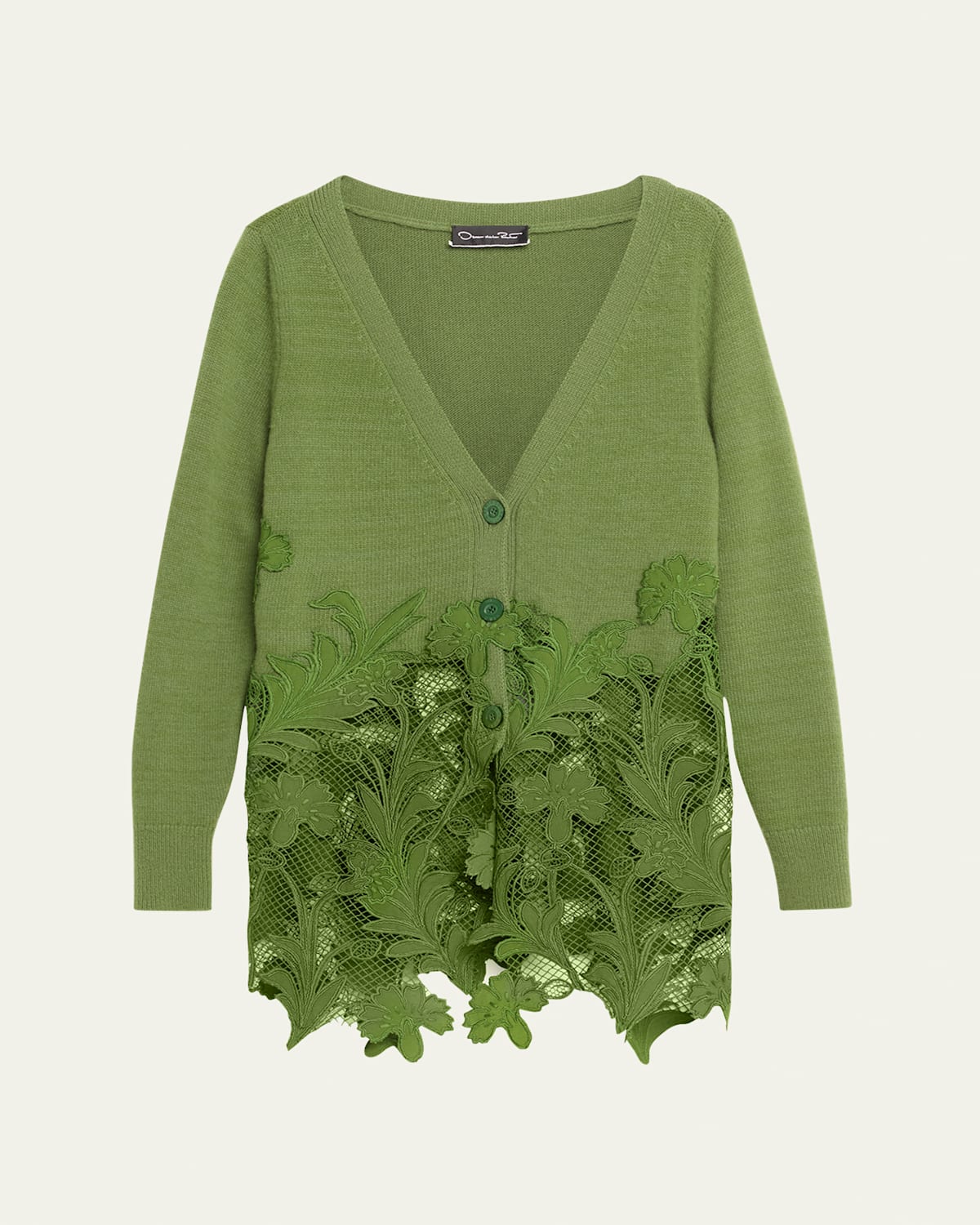 Oscar de la Renta cardigan in marbled carnation guipure V neckline Long sleeves Classic fit Hem falls to the hip Buttonfront Polyester Made in Italy