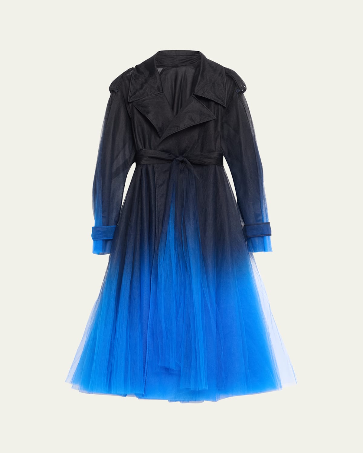 Oscar de la Renta opera coat in ombredyed tulle Notch lapels; wrap front Long sleeves; belted cuffs Shoulder epaulets Rainshield back Selftie belted waist Aline silhouette Full length Nylon/polyamide Made in Italy