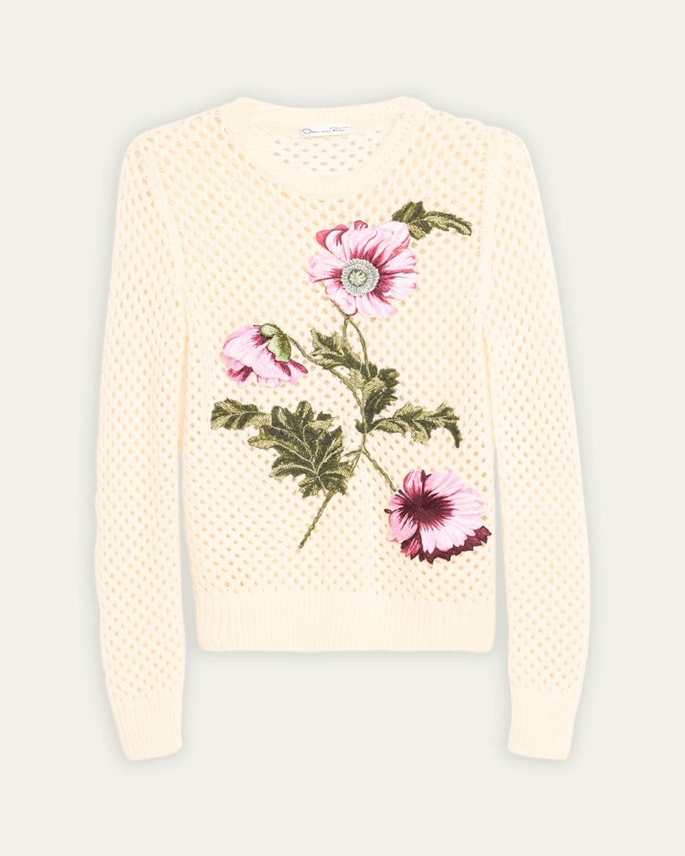Oscar de la Renta openknit top features threadwork embroidered poppies at the front Jewel neckline Long sleeves Ribbed trim Hip length Relaxed fit Virgin wool Dry clean Made in Italy