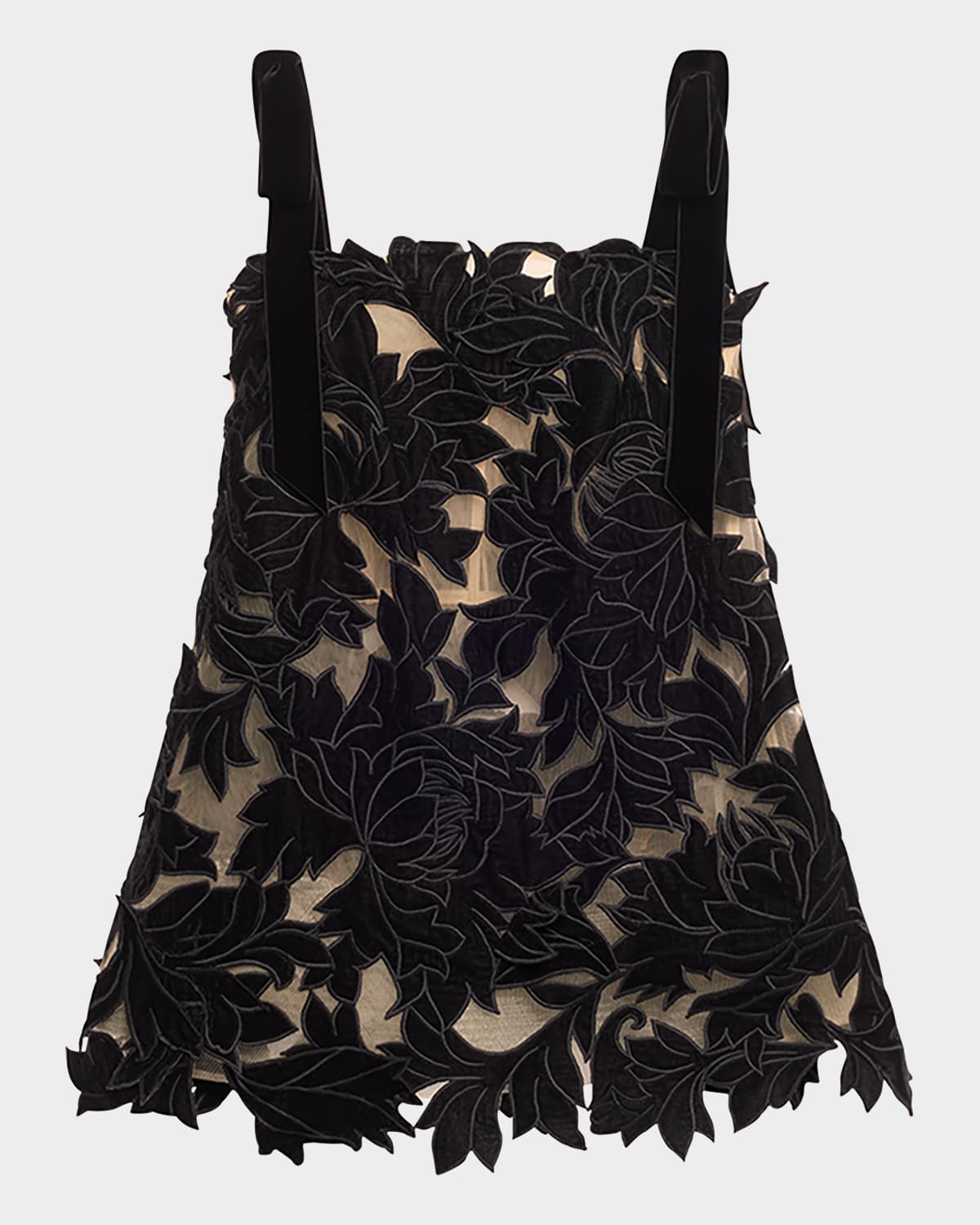 Oscar de la Renta peony guipure embroidered dress featuring velvet selftie straps and inner corsetry construction Square neckline Sleeveless Sheath silhouette Mini length Invisible back zip Nylon/polyamide/cotton Dry clean Made in USA