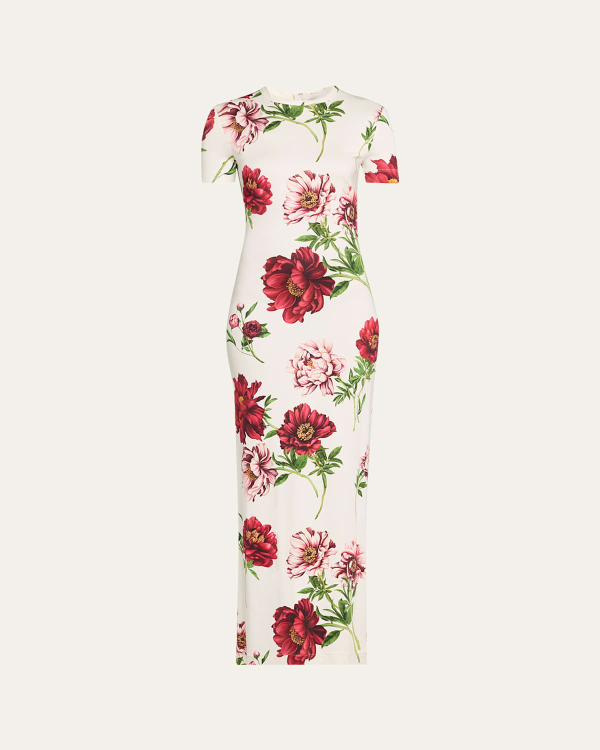 Oscar de la Renta day Tshirt dress in peony printed jersey Round neckline Short sleeves Sheath silhouette Full length Back slit Zip closure Viscose/elastane Dry clean Made in Italy