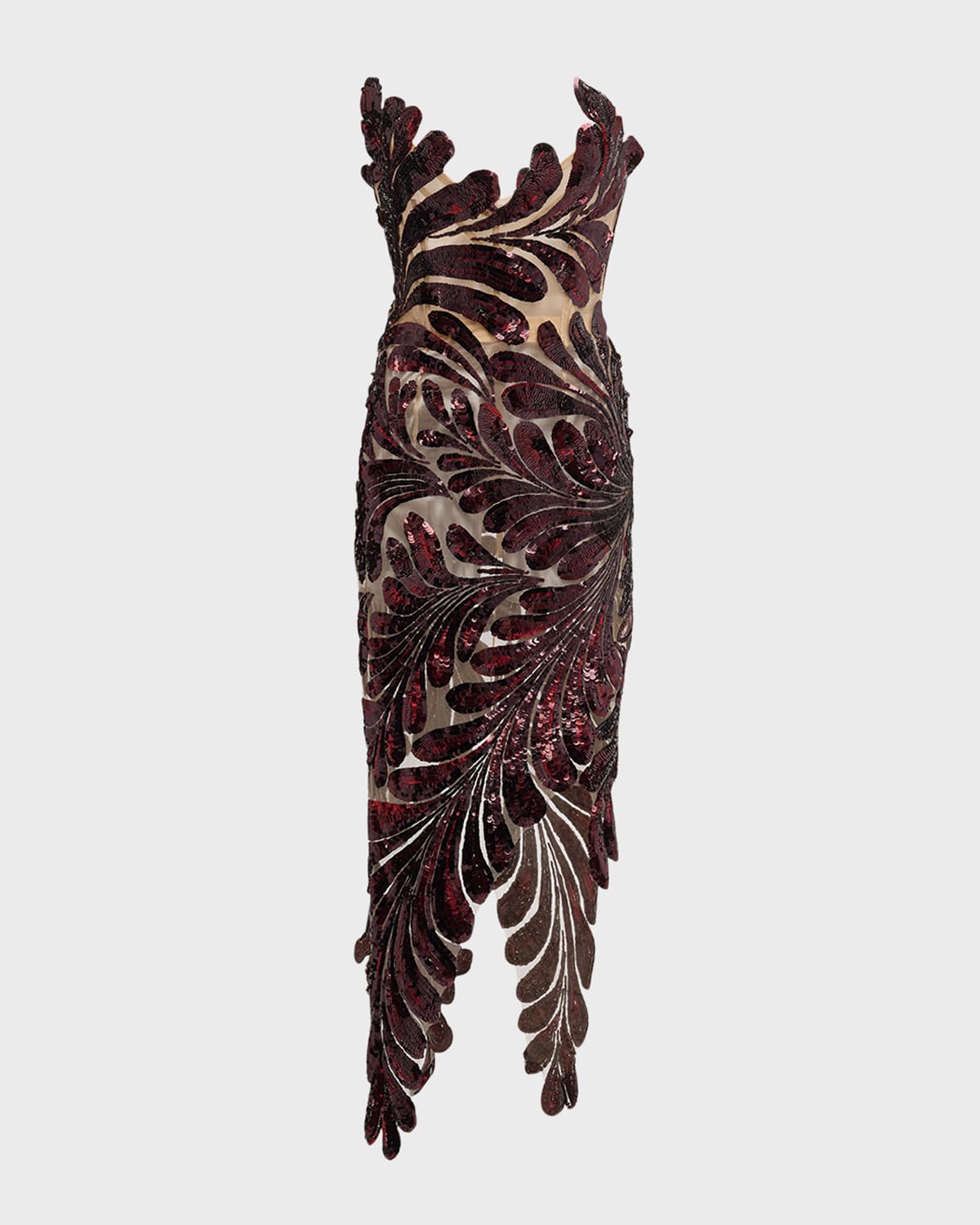 Oscar de la Renta tulle midi dress features fern sequin embroidery throughout Strapless neckline Sleeveless Asymmetric hem Hem hits around the knee Sheath silhouette Concealed back zip Nylon/polyamide Lining: Nylon Dry clean Made in USA