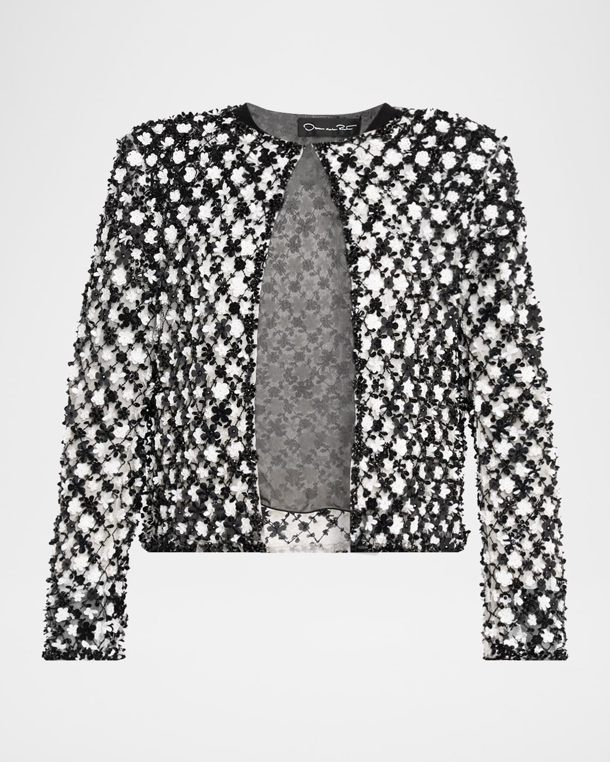 Oscar de la Renta tailored jacket embellished with flower sequin embroidery Round neckline Long sleeves Relaxed fit Hip length Hook closure Nylon/polyamide Dry clean Made in Italy
