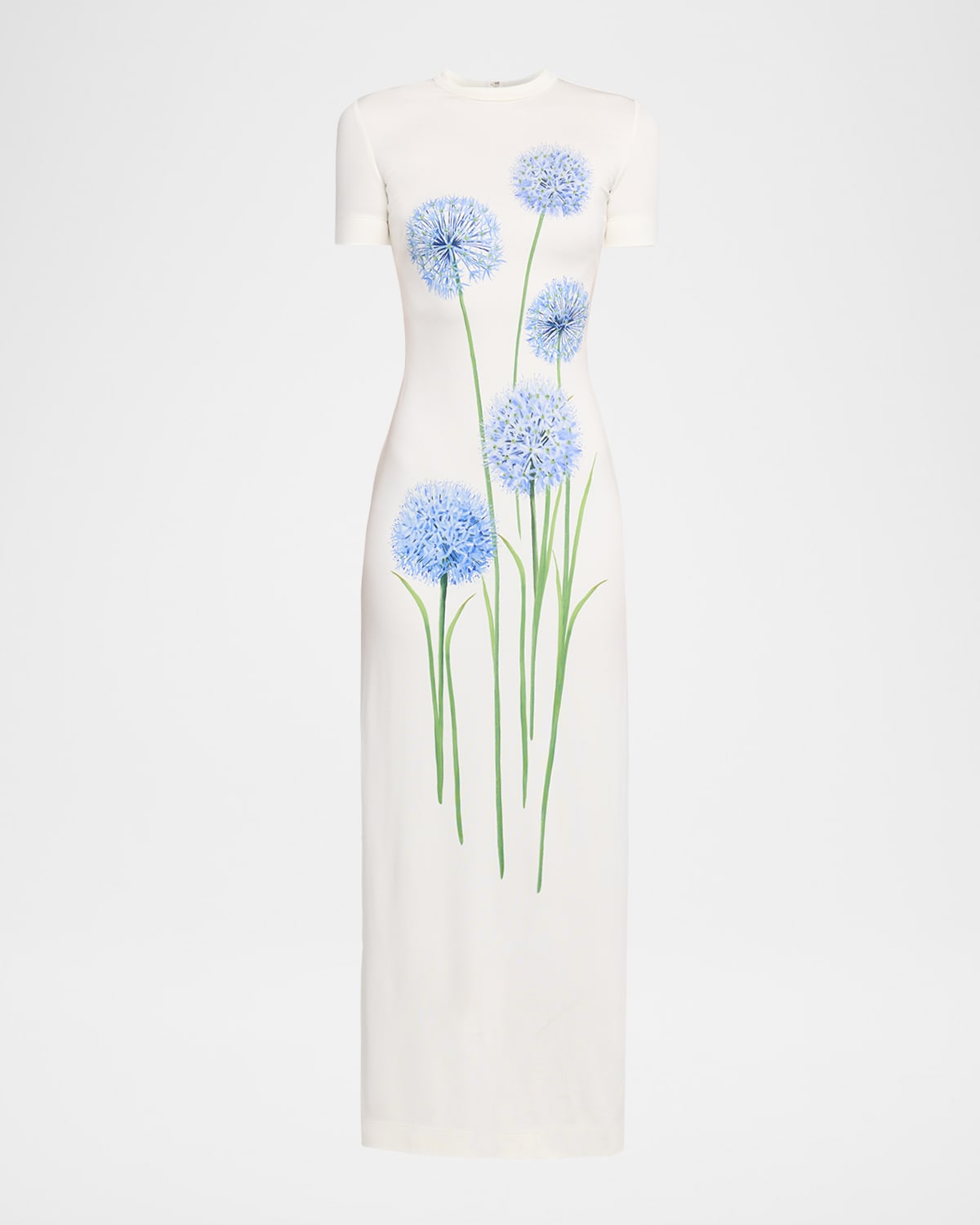 Oscar de la Renta dress is crafted of a viscose jersey adorned with an allium flower print on the front Oscar de la Renta's PreSpring 2026 collection celebrates the vibrancy of a garden in full bloom, inspired by creative director Laura Kim's own garden, bringing each piece to life on and off the runway High neckline Short sleeves Slim, column silhouette Full length Centerback slit hem Invisible back zip Viscose/elastane Unlined Dry clean Made in Italy