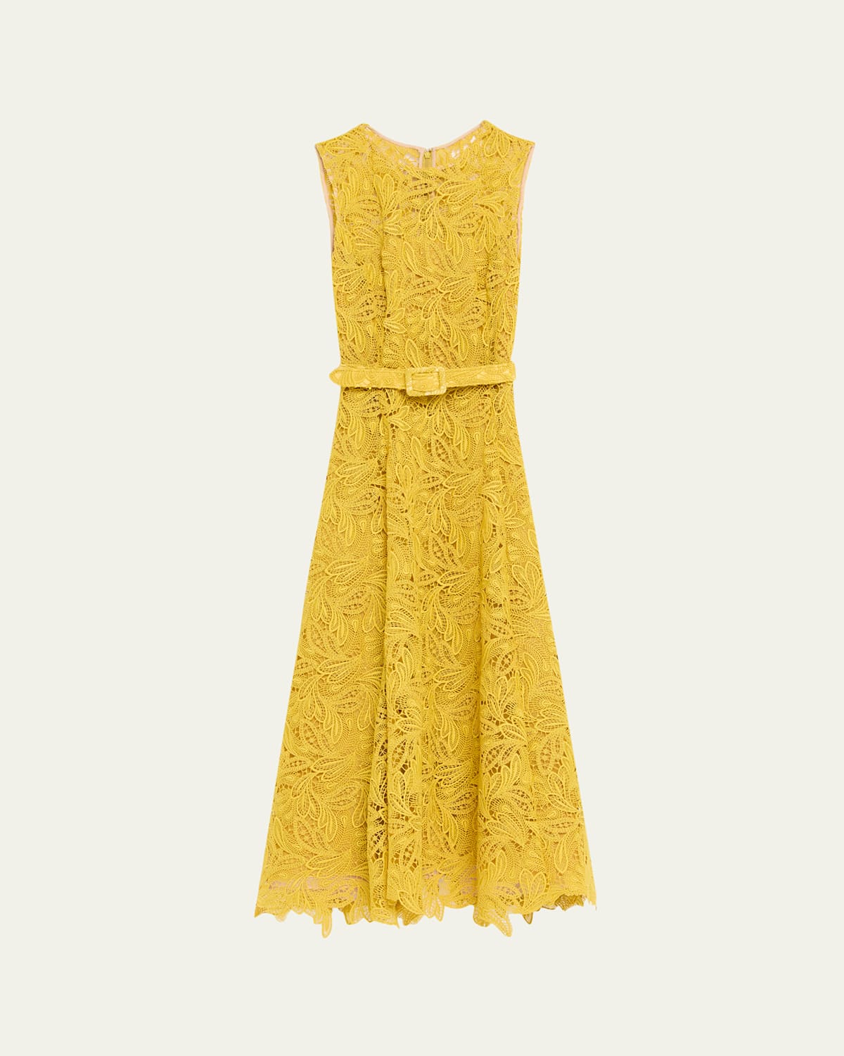 Oscar de la Renta day dress in feather scroll guipure with a self belt Round neckline Sleeveless Belted waist Aline silhouette Hem falls below the knee Zip closure Polyester Dry clean Made in Italy