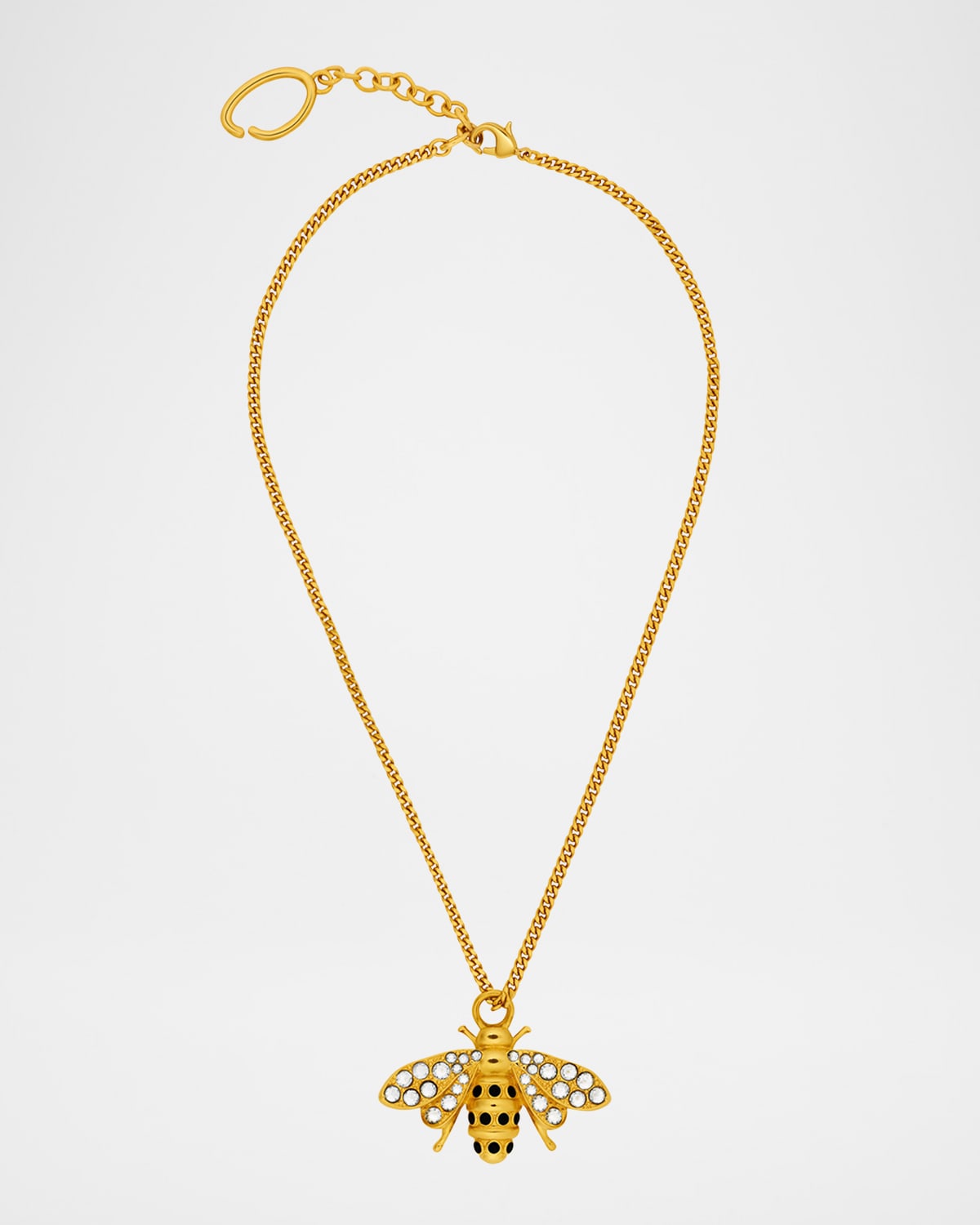 Oscar de la Renta uses this pendant necklace to portray a small bee with open wings. The body and wings of the bee are detailed with black and white crystals. Approx. 1618" length; 0.5" pendant (13mm) 24karat goldplated brass Twotone glass crystals Adjustable length Lobster clasp Made in Italy