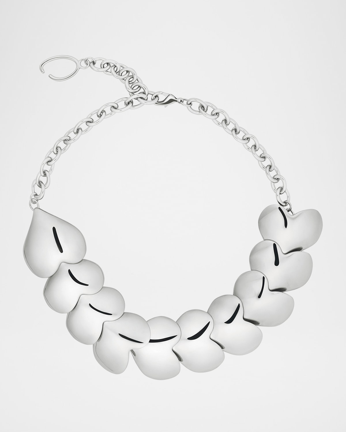Large and lovely, this Oscar de la Renta necklace is designed with ten overlapping smooth domed hearts. Approx. 18" length (46cm) Silvertone brass Adjustable length Lobster clasp Made in Italy