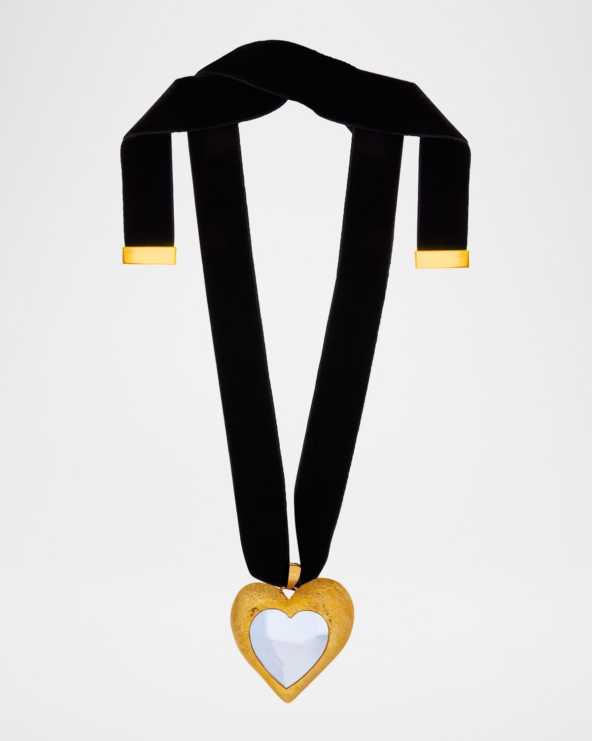 A thick velvet ribbon is strung with a jeweled heart for this Oscar de la Renta necklace. Wear this necklace tight for a choker style or with a loose fit for a traditional pendant necklace. Approx. 39.4" length Shiny goldtone brass Plexiglass rhinestone Adjustable length Selftie ribbon Made in Italy