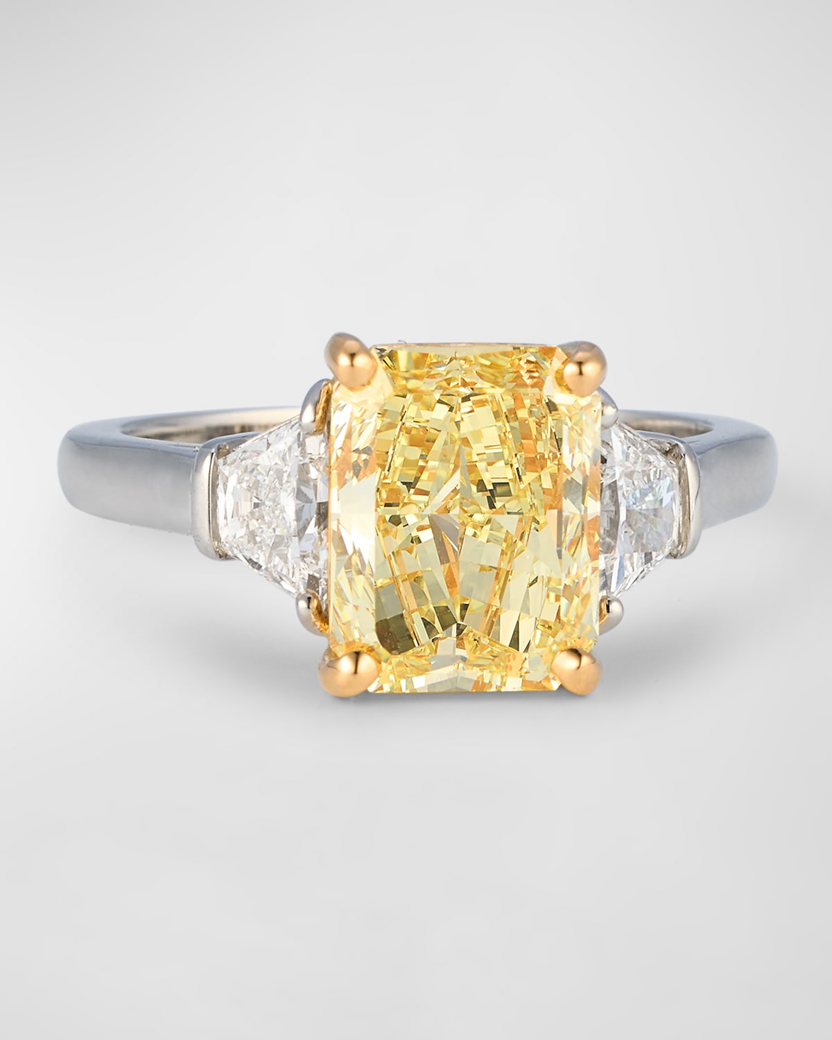 Oscar Heyman ring Approx. ring size 6.5 Polished platinum and 18karat yellow gold Emeraldcut fancy yellow diamond; 3.06 total carat weight Brilliantcut trapezoid diamonds; 0.65 total carat weight Made in the USA from imported materials