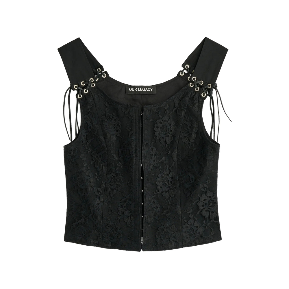 black floral lace overlay eyelet detailing with tie-fastening straps hook-and-eye front fastening scoop neck sleeveless straight hem silver-tone hardware
