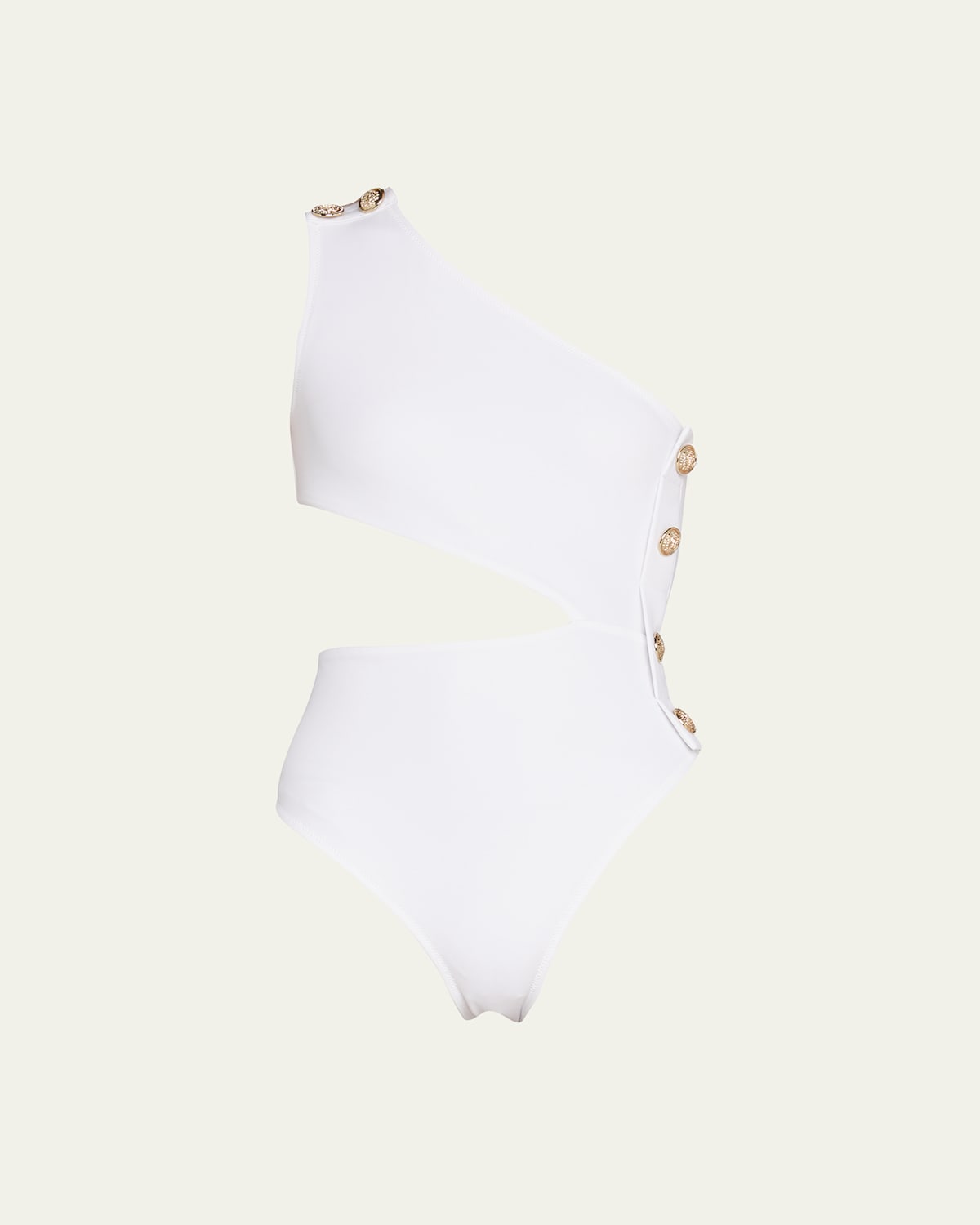 OYE Swimwear "Rhea" interlock knit onepiece swimsuit features side cutout and golden buttons. Oneshoulder neckline. Wide button strap at right. Moderate cheeky seat coverage. Nylon/Lycra® spandex. Hand wash. Made in Turkey.