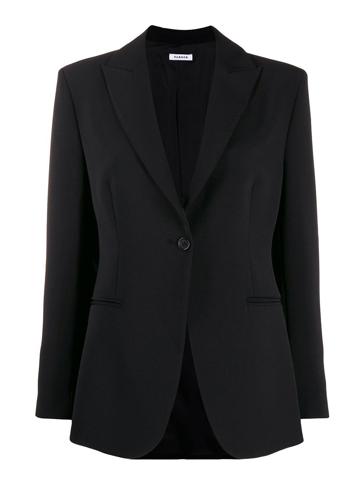 Blazer noir ajusté à boutonnage simple de la marque P a r o s h, doté de revers classiques, de manches longues boutonnées, de poches latérales et d'un ourlet incurvé