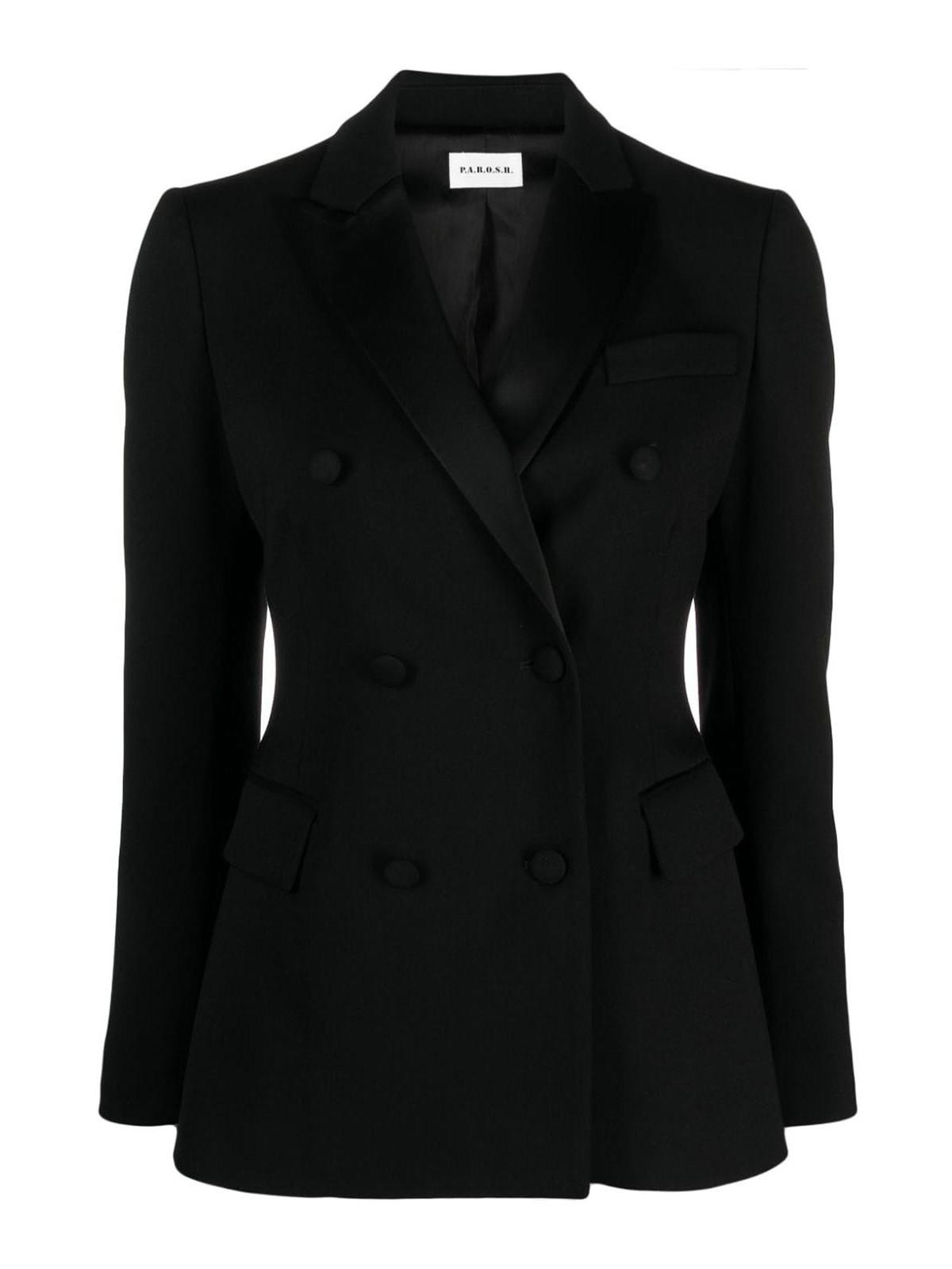 Boutons recouverts de tissu noir mélangé ton sur ton, revers pointus, boutons à double boutonnage, manches longues, poignets boutonnés, poche passepoilée sur la poitrine, deux poches à rabat, ventilation arrière américaine, ourlet droit