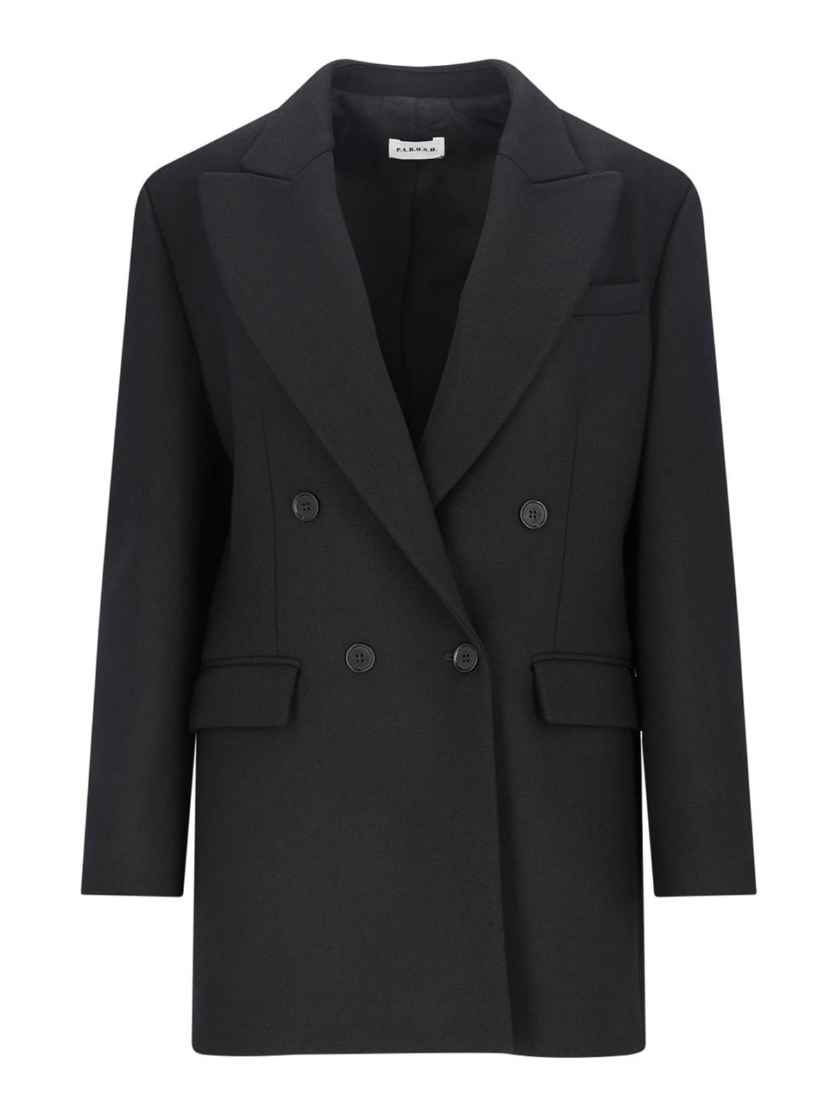 Blazer noir à double boutonnage en stretch avec revers en pointe, boutons et poignets, poche poitrine, deux plis sur le devant, deux poches latérales à rabat, une poche arrière plissée, ourlet droit
