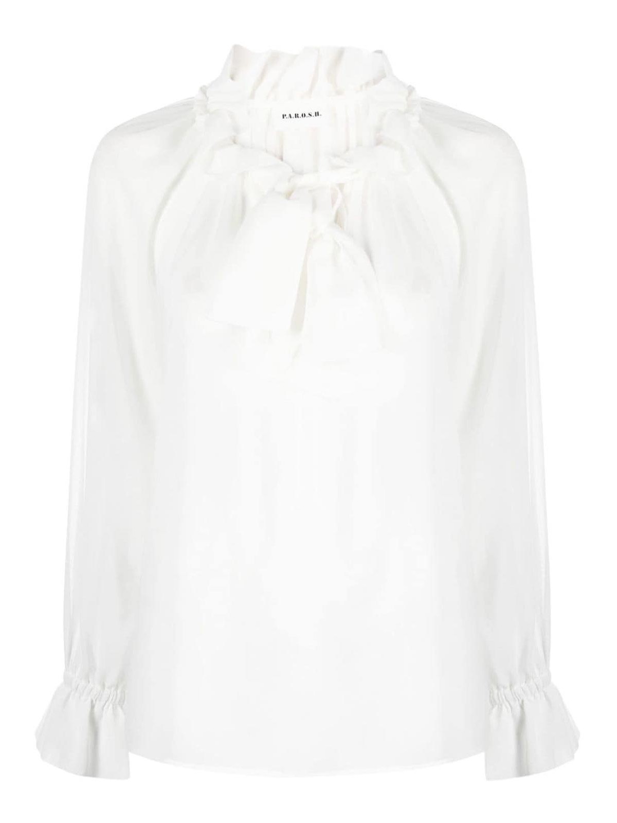 Construction semi-transparente blanche, coutures ton sur ton, détails volantés, cravate au cou, manches longues raglan, poignets évasés, ourlet droit