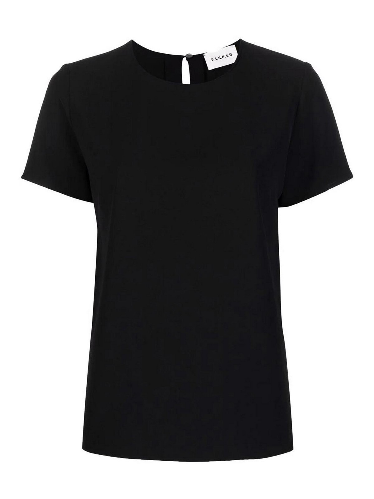 Trou de serrure noir à l'arrière, bouton, col rond, manches courtes, aération centrale, ourlet droit