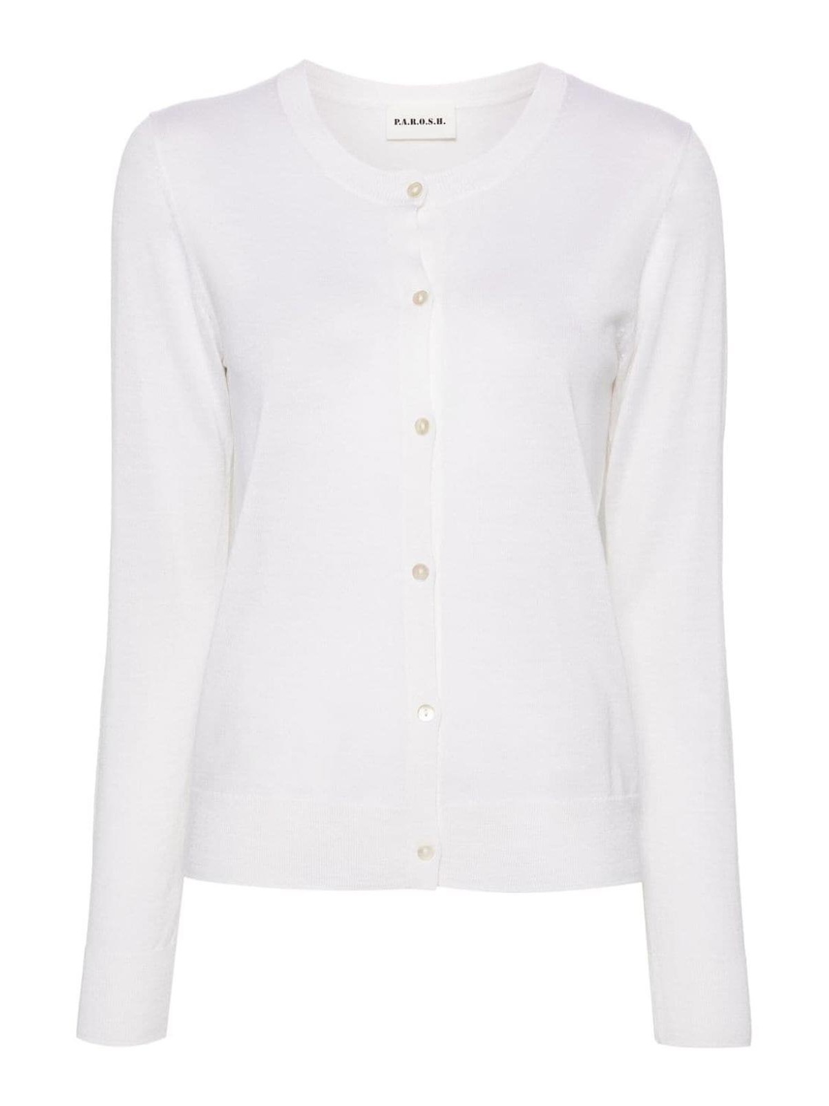 Col rond en maille fine en mélange de vieux cachemire blanc crème, manches longues, poignets et ourlet côtelés, patte de boutonnage non doublée