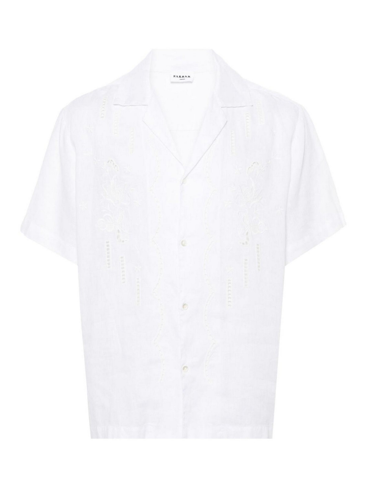 Motif brodé en lin blanc avec coutures ton sur ton, coupe, détails sur le dessus, col campant, manches courtes, ourlet droit, taille standard pour hommes