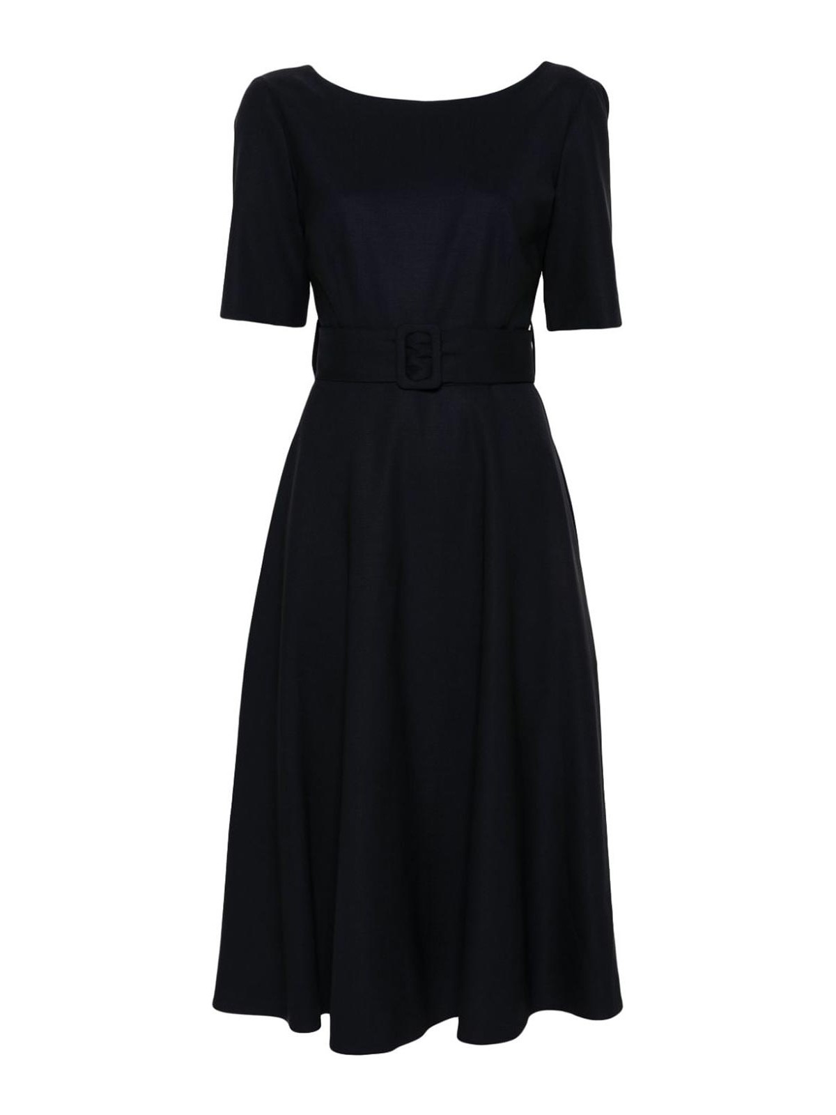 Col rond en mélange bleu nuit, manches courtes, ceinture amovible et ajustable, deux poches latérales, jupe évasée, dos en V, ourlet partiellement droit, mi-long, fermeture éclair arrière dissimulée