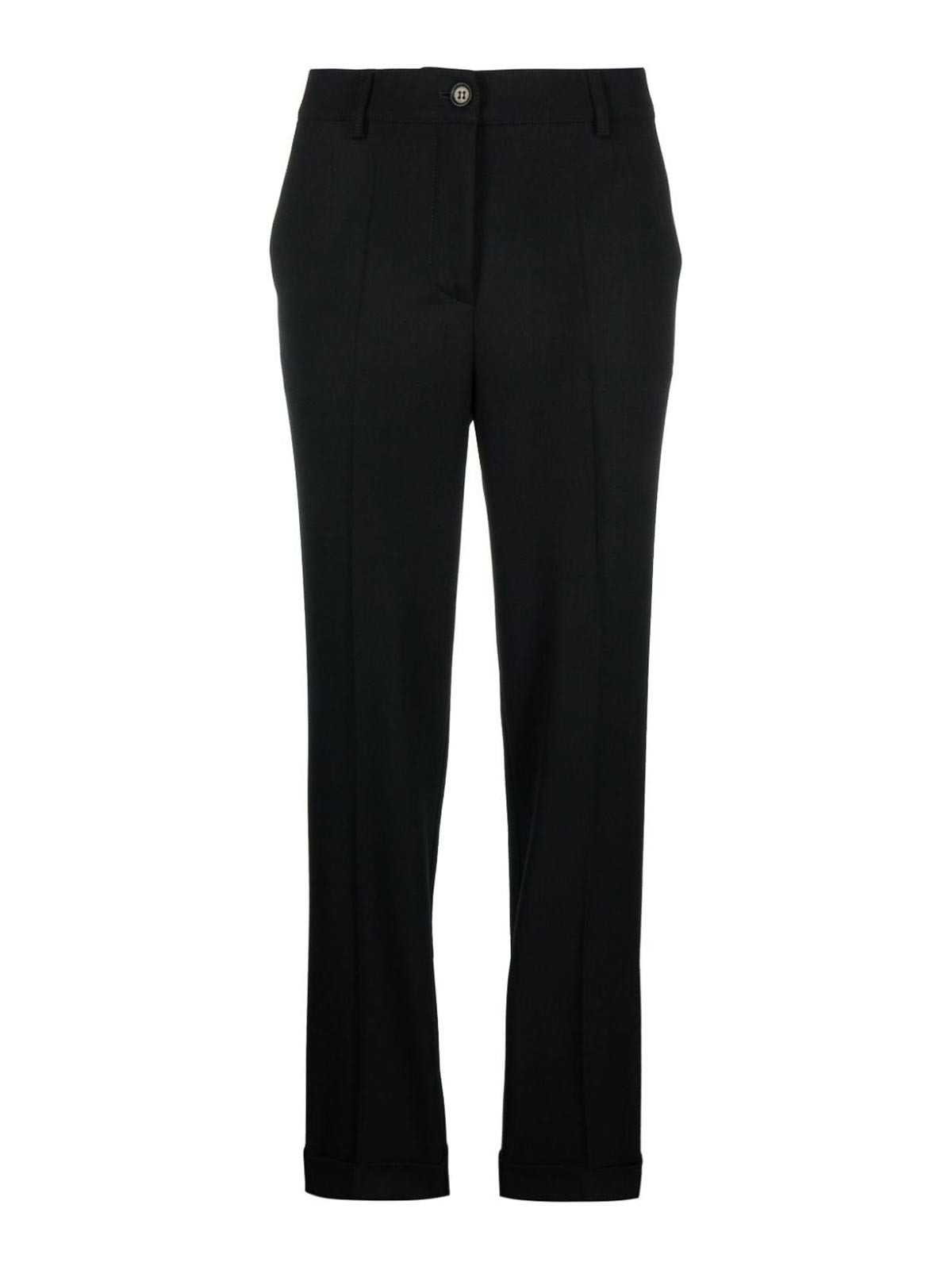 Braguette noire noire à taille basse dissimulée et pli boutonné, deux poches latérales fendues, deux poches arrière passepoilées, passants de ceinture, coupe cintrée, ourlet retroussé, jambe raccourcie