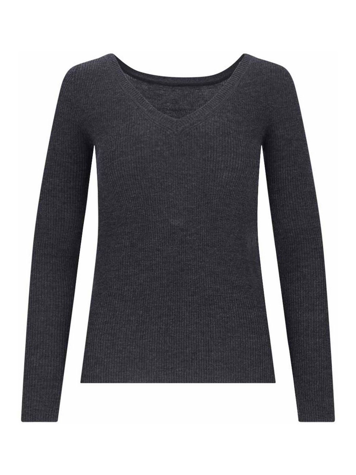 Pull gris à encolure p a r o s h avec finition côtelée, col en V profond, ourlet droit